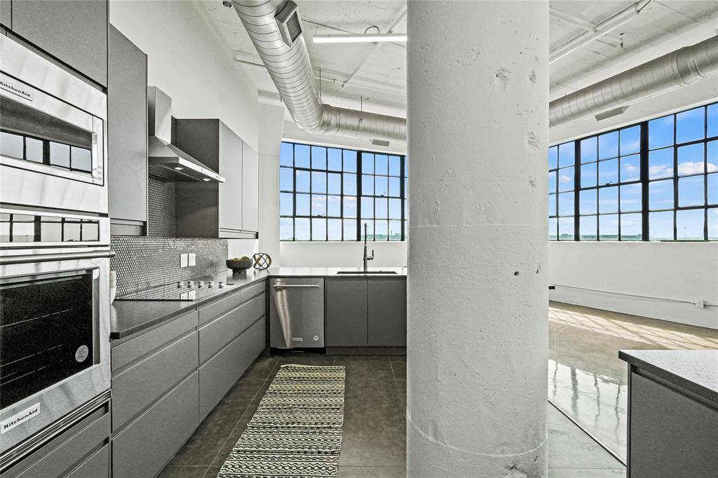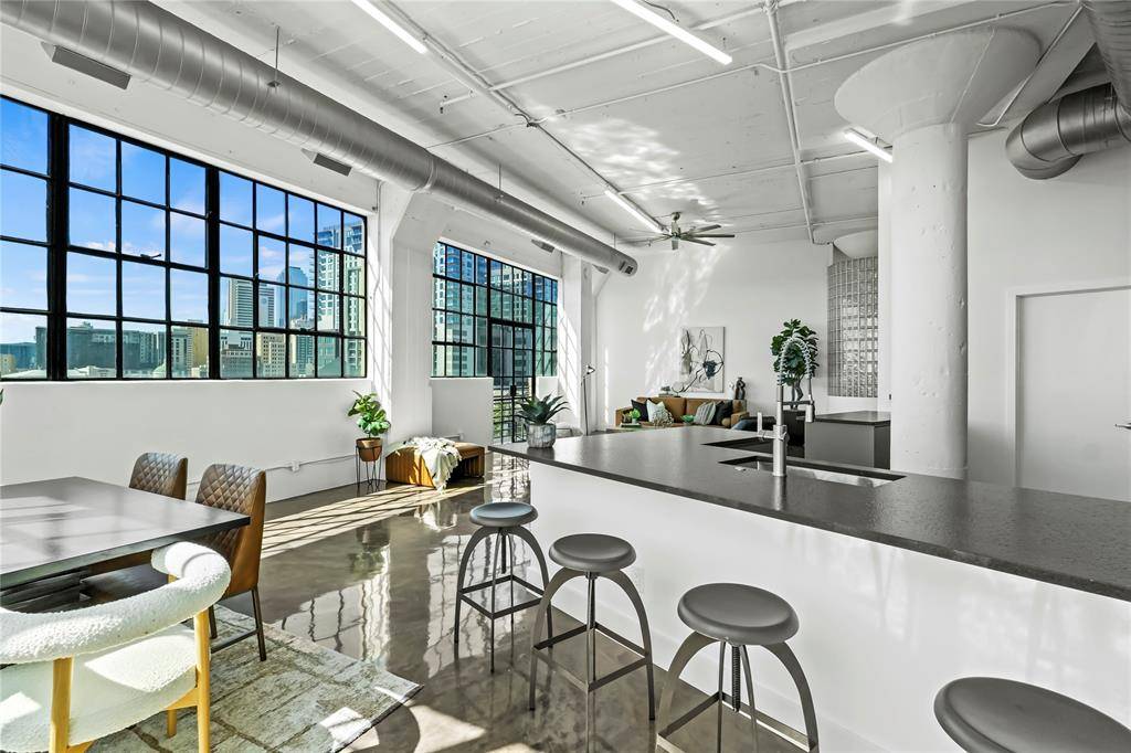 Industrial-chic touches include soaring ceilings, custom concrete floors, and oversized windows that flood the space with natural light and showcase sweeping views of the Downtown skyline. The kitchen is a dream for any home chef, boasting sleek custom countertops, an electric cooktop, breakfast bar, and ample storage.