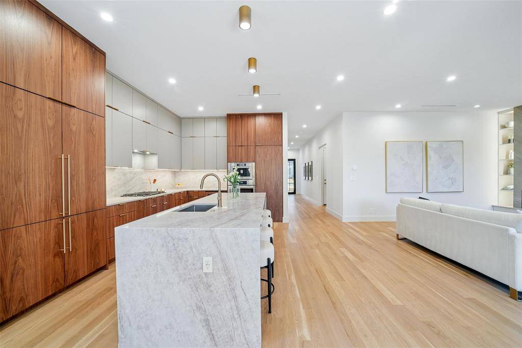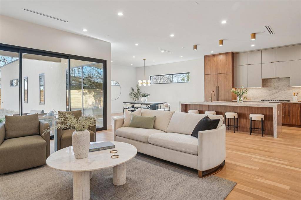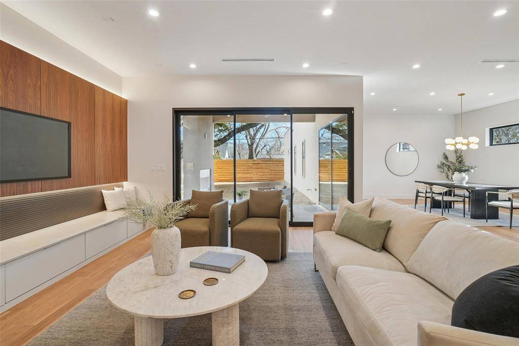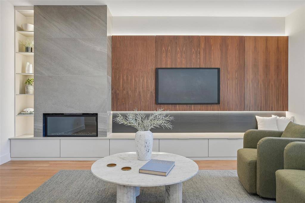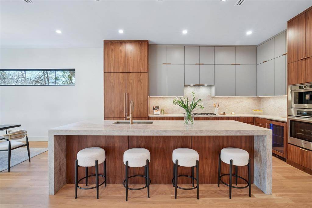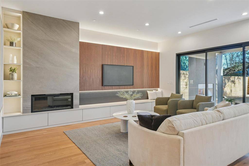 Set along the winding, tree-lined streets of Little Forest Hills, this newly built home feels grounded in a neighborhood known for its sense of community and everyday ease. White oak floors, earthy tones, and clean architectural lines set the tone, with designer finishes and walnut cabinets and accents woven throughout the home. The living space centers around a gas fireplace, creating a comfortable place to unwind. The kitchen is designed for real use, featuring a generous island, walk-in pantry, and a top-tier built-in appliance package including a refrigerator and coffee maker. The primary bedroom is located on the first floor, with additional bedrooms upstairs complemented by well-finished secondary bathrooms. An upstairs media room offers a flexible retreat for movie nights or quiet downtime. Outside, a landscaped yard with a covered patio, outdoor fireplace, and gas grill connection extends daily living outdoors. Lifetime siding and modern rooflines complete a home that feels intentional, comfortable, and easy to live in.