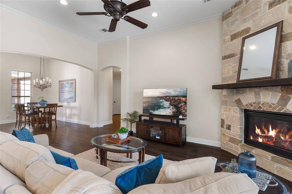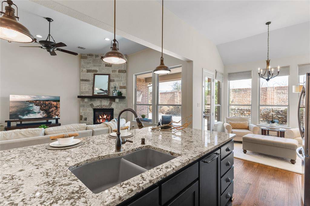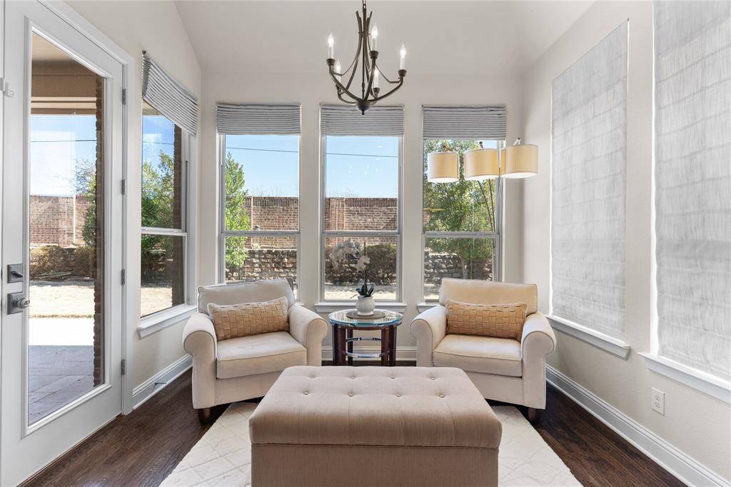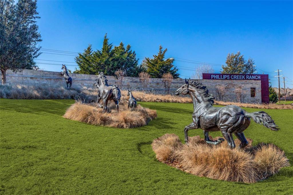 Rare Find! You'll love the unique gated courtyard design that sets this property apart. Discover this beautifully upgraded and spacious single-story with 4 bedrooms, 4 baths and a private study. From the moment you enter through the gate, and step into the private courtyard and custom iron front door, you'll notice the exceptional quality and high ceiling that create an open, airy feel. Highlights include a stone fireplace with a raised hearth, a custom Chandelier designed by a Chicago artist, upgraded cabinetry with spice pull-outs, high-level granite countertops, Monogram cooktop, and double ovens. Additional features such as plantation shutters, a covered and expanded stone patio, landscaped backyard, two tankless water heaters, new roof (2023) and epoxy-coated garage floor further enhance this home's appeal. Relax and unwind in the superb 18x14 primary suite, complete with sitting area and spa-style ensuite bath. This 5 Star Phillips Creek master plan includes front yard maintenance, a clubhouse, fitness facility, 2 pools, splash pad, parks, 18+ miles of scenic trails, a fishing pond, electric car charging and over 100 acres of green space. There's always something to do and someone to meet in this vibrant neighborhood at monthly events or at the Texas Backyard with bocce ball, horseshoe courts, volleyball & BBQ grills. Convenient location just minutes from DNTollway, The Star-4.3 miles, PGA District-8 miles, Legacy West-2.9 miles, Grandscape-5 miles, shopping & dining. Top-Rated Frisco ISD schools—elementary, middle, and high—are conveniently located within the neighborhood.