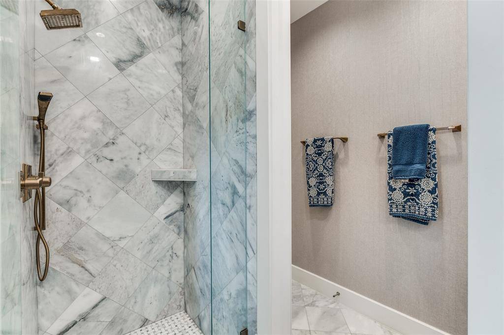 The primary suite serves as a true retreat, highlighted by a beautifully appointed marble bath featuring a spacious dual-entry glass shower, separate vanities with abundant storage, and an impressive 21-foot custom closet. A guest suite with ensuite bath offers versatility for visitors, a home office, or a charming nursery.