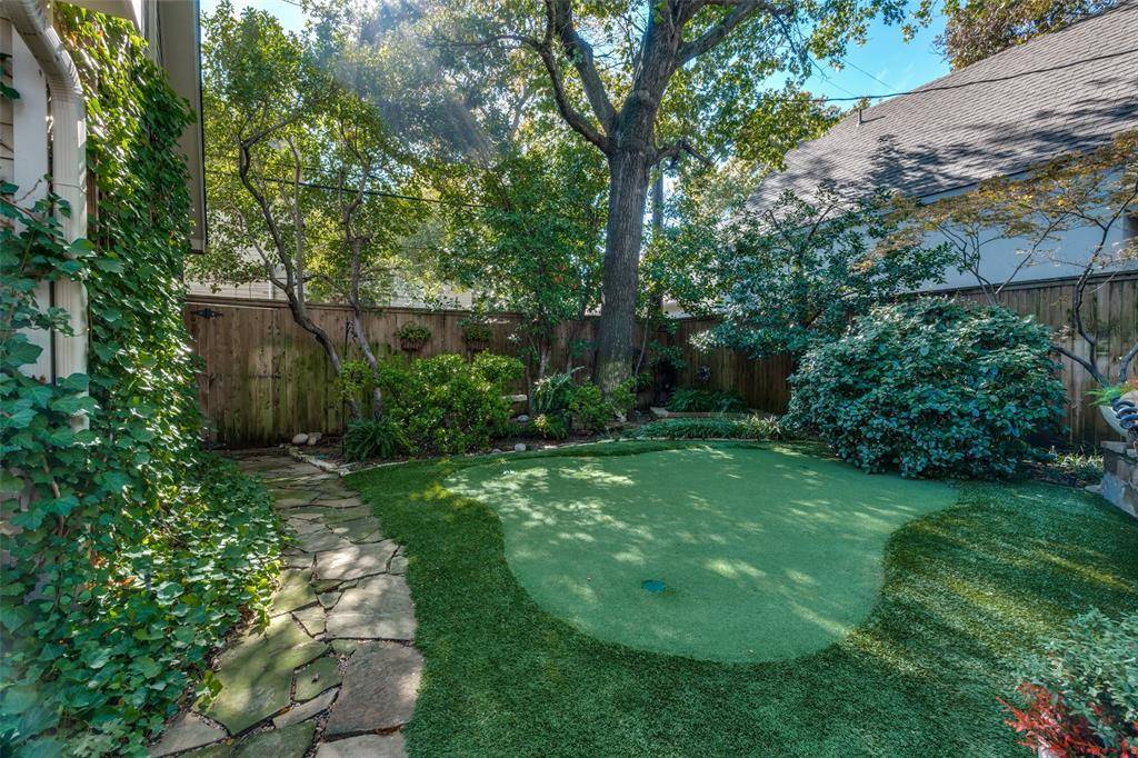 Step outside to discover a beautifully landscaped private backyard, complete with lush turf and a putting green. An outdoor seating area is perfect for gatherings, featuring a built-in grill and fireplace, all sheltered by a new pergola, creating an oasis for relaxation and enjoyment.