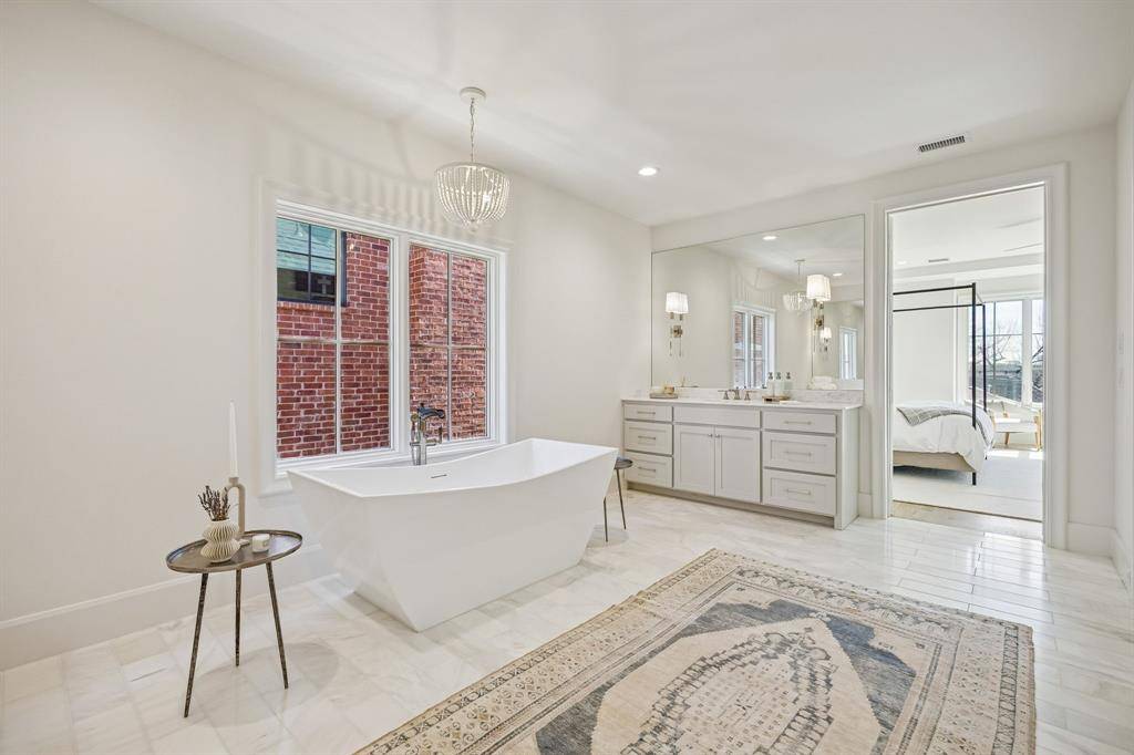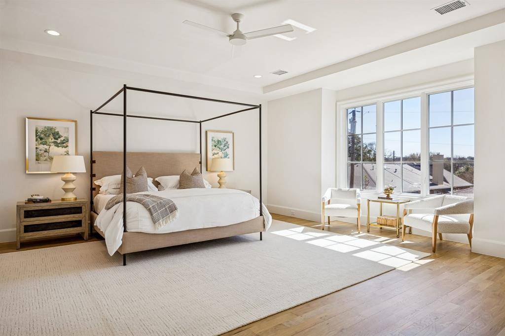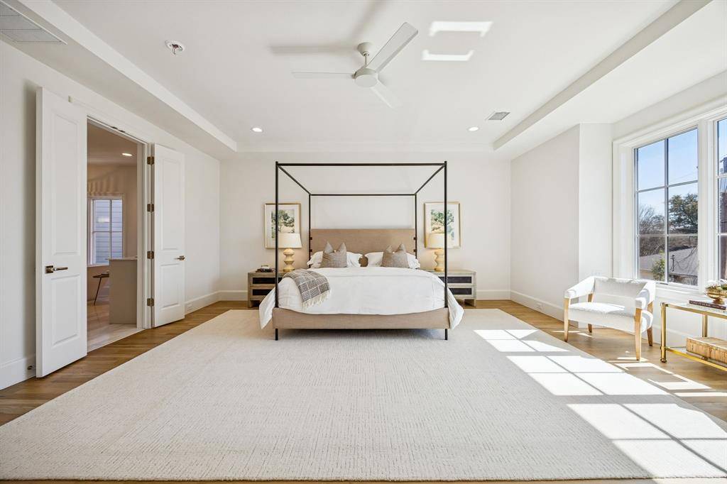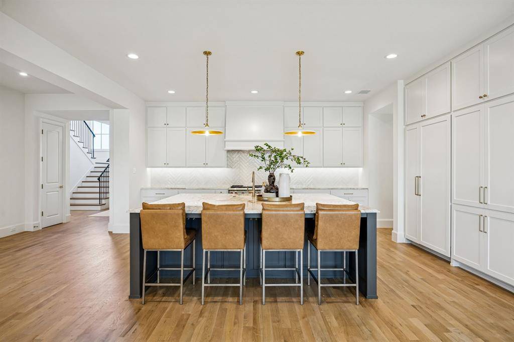 The kitchen is the heart: a Wolf six-burner cooktop, oversized Taj Mahal quartzite island, and walk-in pantry ready for everything from weeknight dinners to holiday hosting. White oak floors and dramatic Pella windows flood the home with natural light, creating an airy, elegant ambiance.