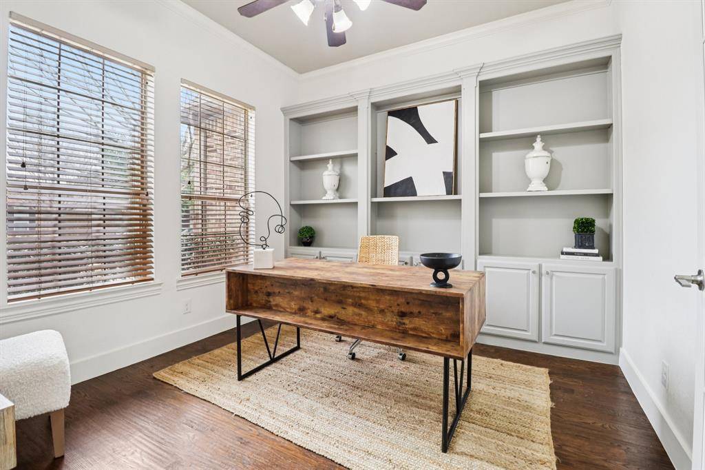 The flexible floor plan features both the primary suite and a secondary bedroom on the main level, offering an ideal setup for guests, multi-generational living, or changing household needs, plus a dedicated home office with custom built-ins.