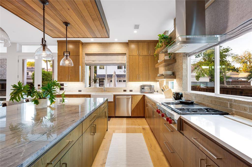 Inside, wide-plank white oak floors, expansive windows, and clean architectural lines create light-filled living spaces designed for both everyday comfort and entertaining. The open kitchen, dining, and living areas are anchored by a striking brick feature wall and a dramatic marble waterfall island. The chef's kitchen is equipped with Wolf appliances, custom cabinetry, generous prep space, and a walk-in pantry.