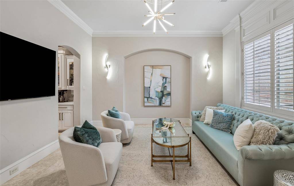 The main level is thoughtfully designed for both everyday living and upscale entertaining, featuring a private executive office, formal dining room, den, and an expansive living area overlooking the grounds. The chef's kitchen has been beautifully updated with custom cabinetry, an oversized island, and high-end stainless steel appliances, seamlessly opening to the main living spaces.