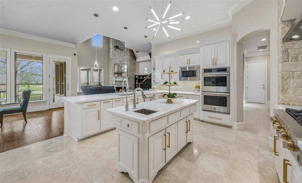 A grand entry introduces soaring ceilings, rich hardwood and marble flooring, a sweeping curved staircase, and extensive custom millwork, creating a refined yet welcoming atmosphere. Expansive windows frame stunning views of the backyard and golf course beyond while filling the home with natural light.