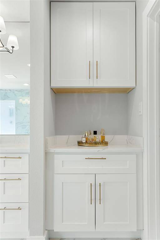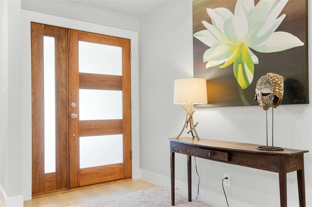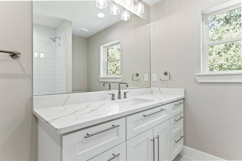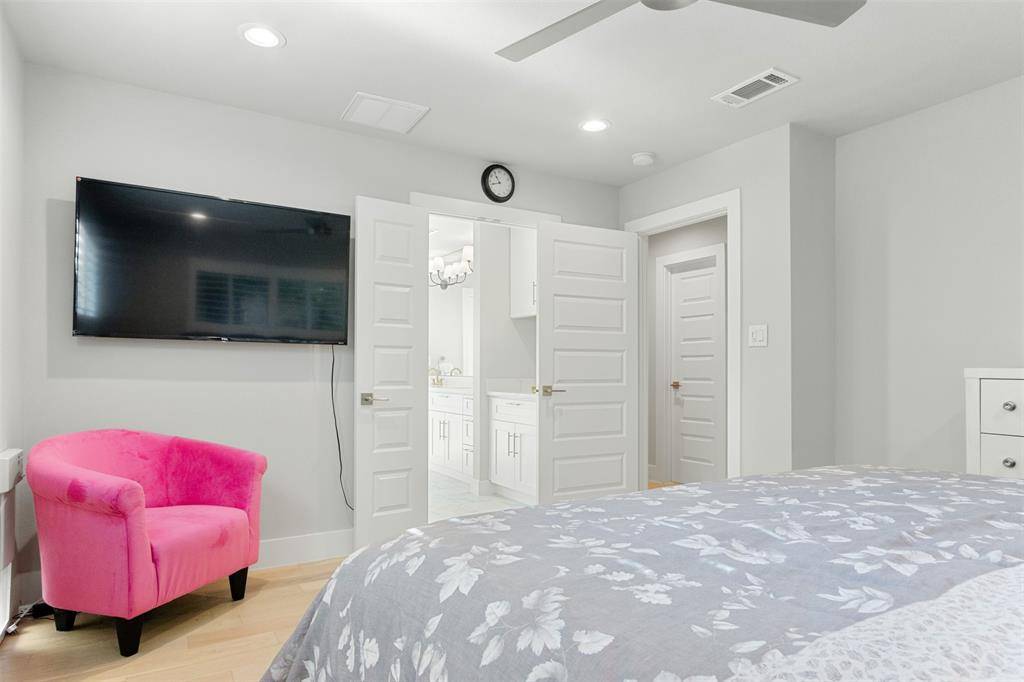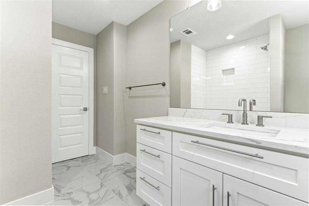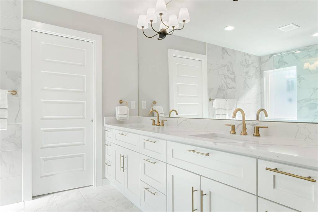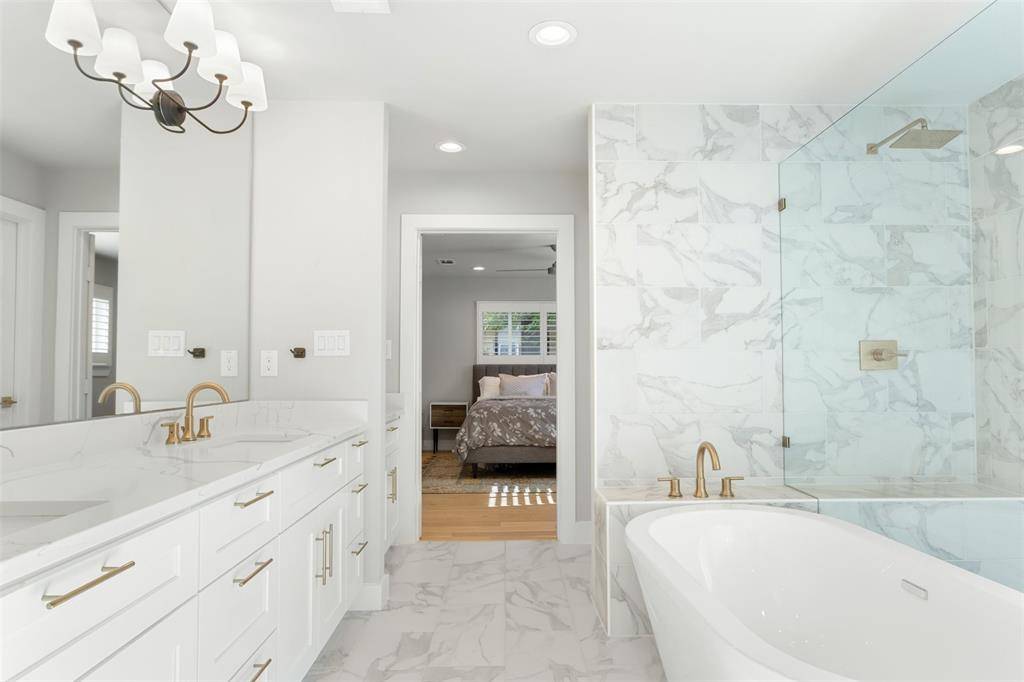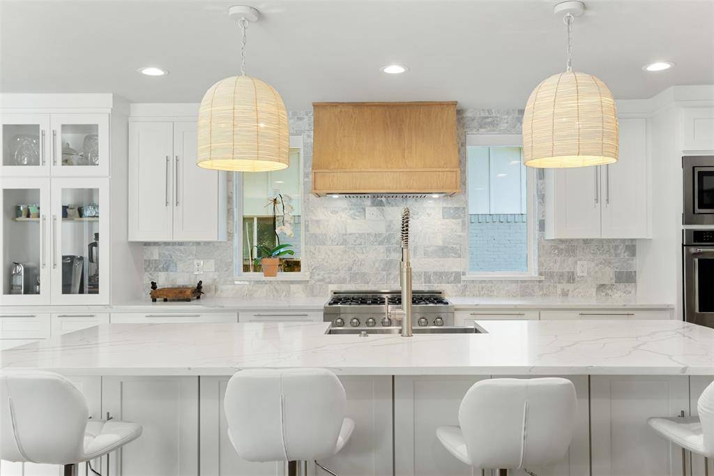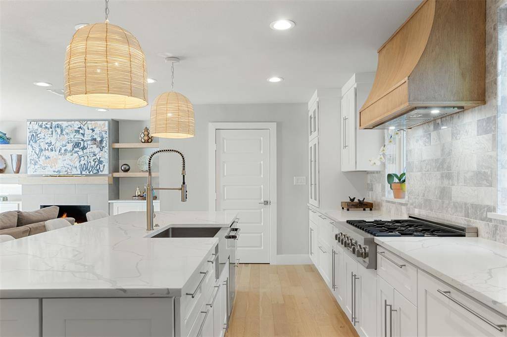 Light wood floors, an impressive 10-foot island, floating shelving, white quartz surfaces, and curated designer fixtures create a clean, elevated aesthetic throughout. There is abundant storage with plenty of built-ins.