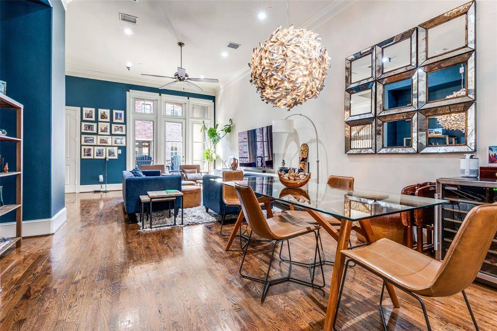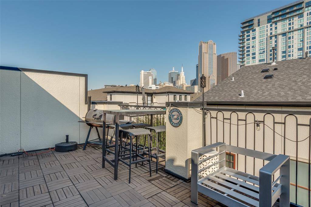 Reminiscent of a Manhatten brownstone, this stunning, three-level townhouse with rooftop terrace facing the skyline is located on a quiet, interior street and combines sophistication, comfort, and the best of contemporary living. For those seeking an urban experience in downtown Dallas, this is a perfect opportunity in the Intown Homes of Farmers Market. The community is beautifully maintained and perfect for strolling. The Living Room-Dining Room-Kitchen on level 2 are open, with balcony off LR. Powder room--half bath is off Living Room. Hardwood floors, 12 foot ceilings, ceiling fan. The showstopper cook's kitchen offers large island with a breakfast bar, granite countertops, stainless-steel appliances, gas cooktop, built-in microwave, tiled backsplash, & walk-in pantry. Third bedroom is on first level. All bedrooms have ensuite baths. Primary bedroom has ceiling fan. Master bath features jetted tub, double sinks, granite vanity, large WIC. Rooftop deck looks to Dallas skyline -- room for sitting, grilling, and eating. Refrigerator, washer and dryer remain with the property. Three thermostats. Tankless water heater. Blinds, window treatments, recessed lights. Entertaining is a dream in this home, whether inside or on the rooftop deck. Two-car rear entry garage. Accessible to major freeways. This is a fantastic opportunity!