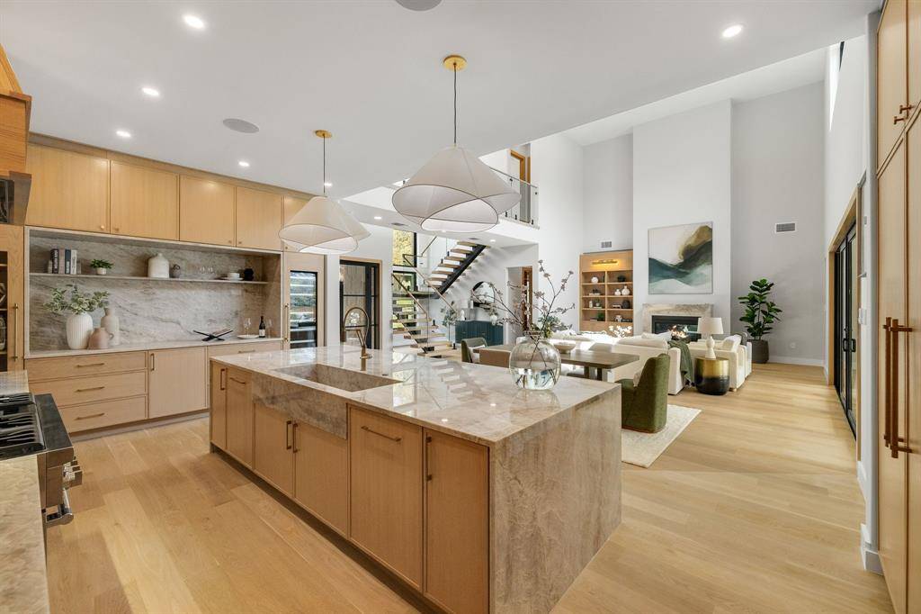 The chef's kitchen showcases Thermador appliances, custom cabinetry, Taj Mahal quartzite countertops, and designer finishes, seamlessly flowing into the open living and dining spaces—ideal for both entertaining and daily living. A striking floating staircase and natural handcrafted granite stone exterior elevate the home's architectural presence.