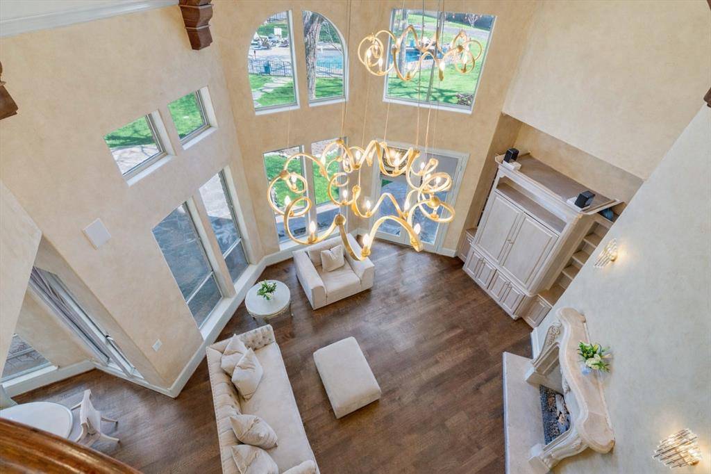 The dramatic double-volume living room is bathed in natural light and overlooks the expansive backyard and resort-style pool—perfect for entertaining, relaxing, or outdoor play. Upstairs, a striking spiral staircase with leaded glass detailing leads to a spacious game room with wet bar, ideal for movie nights, guests, or multigenerational living. The pool features a tanning ledge, with a hole for an umbrella and bubblers.