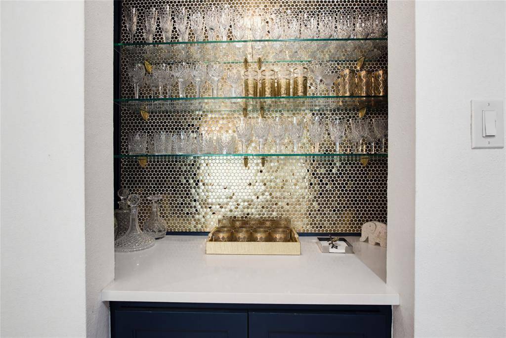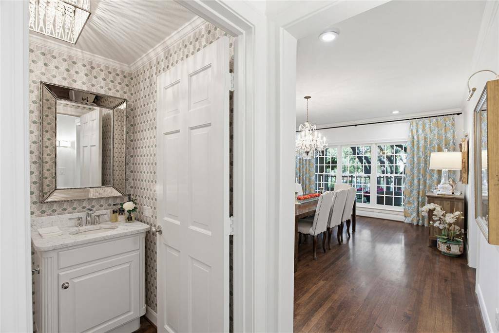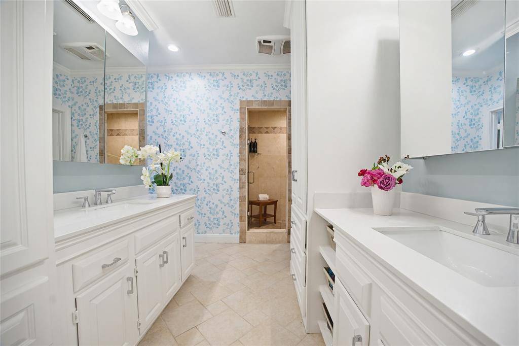 The spacious primary bedroom enjoys a sitting area and large walk-in closet with built-in cabinets. An ensuite spa-like bath is a delight with designer wallpaper, quartz dual vanities with shelves, drawer and cabinets; walk-in shower with multiple shower heads and glass door; and modern lighting and fixtures. Two more updated bedrooms (one with ensuite full bath), and a half bath complete the great floor plan.