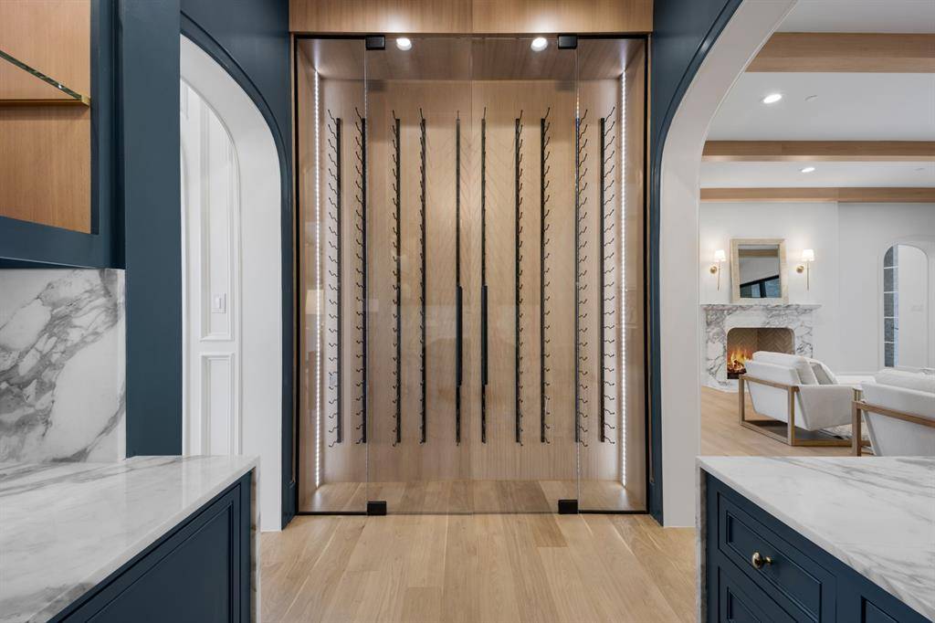The kitchen is refined and beautifully composed. Calacatta Vagli marble surfaces, custom cabinetry, and a suite of Sub-Zero and Wolf appliances create a setting that is as functional as it is elegant. A secondary prep kitchen and walk-in pantry allow the main space to remain pristine.
