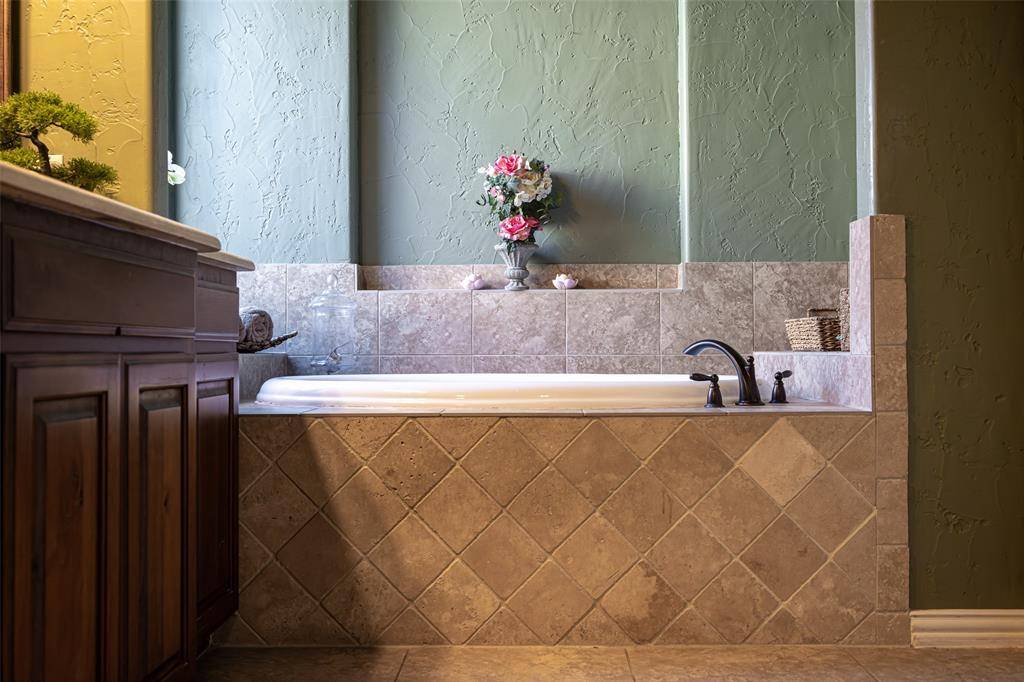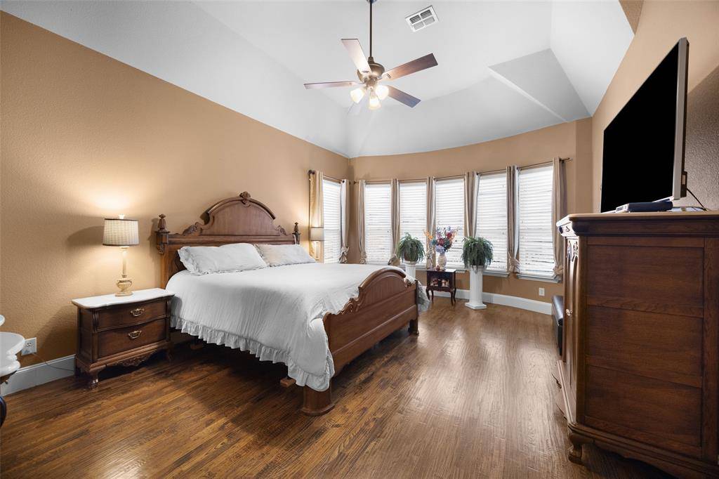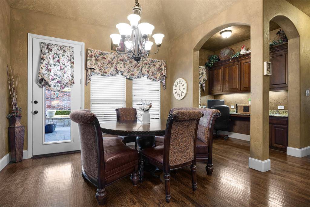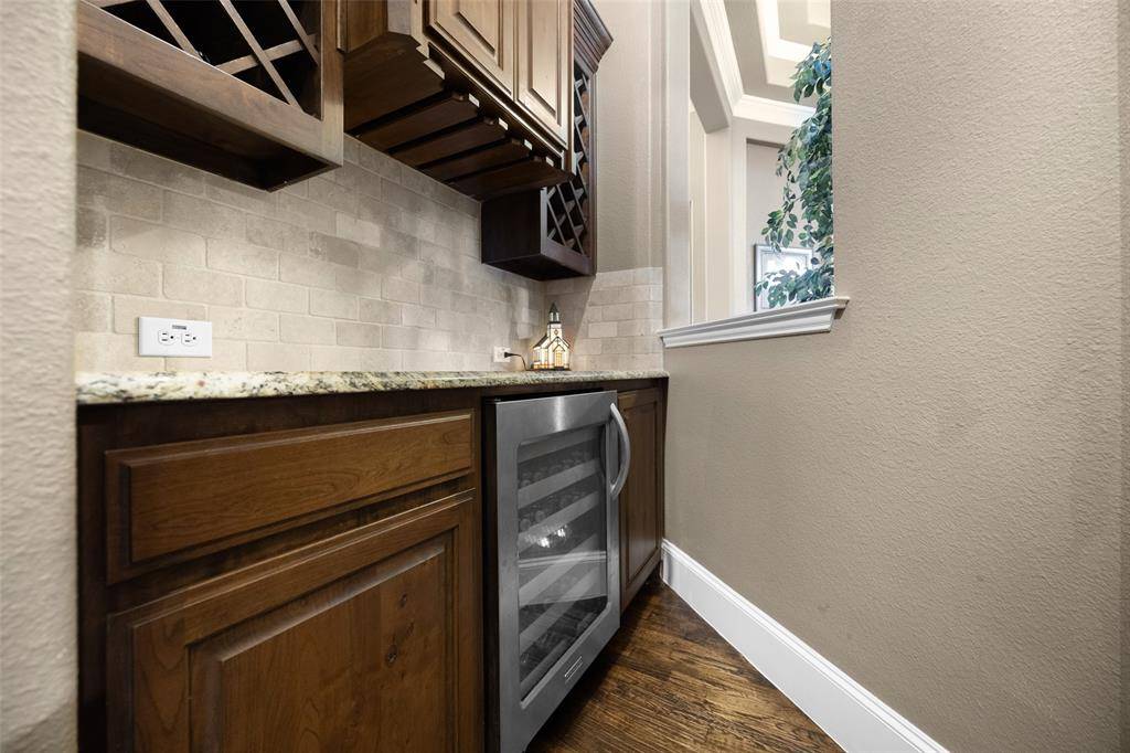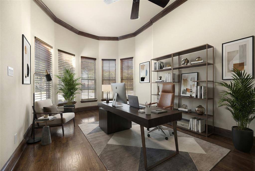 Rare opportunity in the exclusive gated Shores At Waterstone. One-Owner, built by Drees. Well maintained. Single-story. Zoned for Frisco ISD, one of the area's most sought-after communities. Every inch of this residence exudes a sense of calm, comfort, and timeless charm. Featuring elegant wood floors, multiple living and dining areas, including a spacious den with cozy fireplace designed for gatherings and everyday living. Executive-style office filled with natural light from the bay windows and French doors allows for privacy and productivity. Entertain family and friends with the latest movie or sports event from your media room situated within snacking distance just off the kitchen and the dry bar with lattice wine rack and wine fridge. Whether you're a gourmet cook or novice foodie the large kitchen, walk-in pantry and oversized island is the ideal workspace for your culinary creations, easily served in the breakfast nook or formal dining room. Retire to your luxurious primary suite encompassing the east-wing of the home. Peaceful secluded ensuite includes built-ins, dual sinks, garden tub, separate shower, and walk-in closet. West-wing of the house is perfect for kids wanting a game room, or multi-generational families needing a separate living area. Two-bedrooms boast ensuite baths, and a third bedroom offers adjoining bath accessible to the hallway. Summers will be a SPLASH in your waterfall and fountain featured pool complimented by attached spa. Fenced backyard and covered patio provide room for kids and pets creating an outdoor retreat for the whole family.