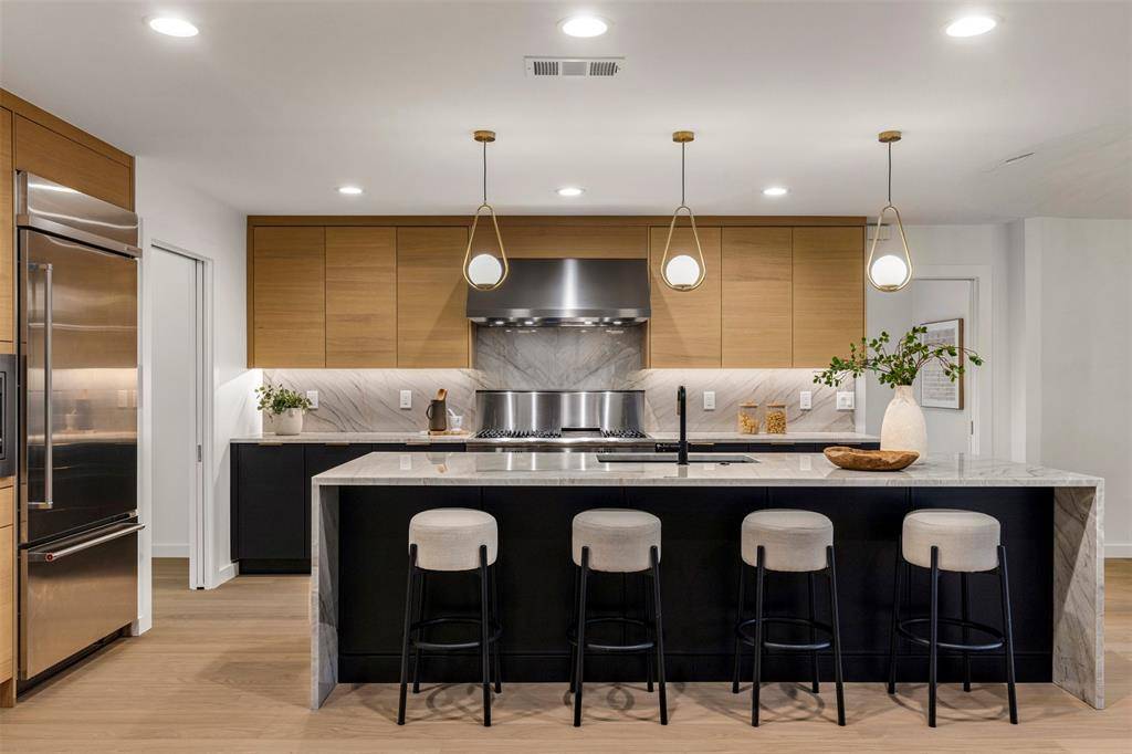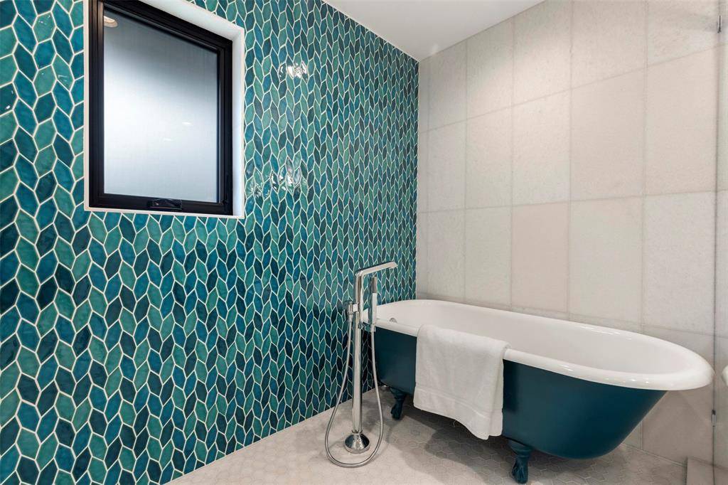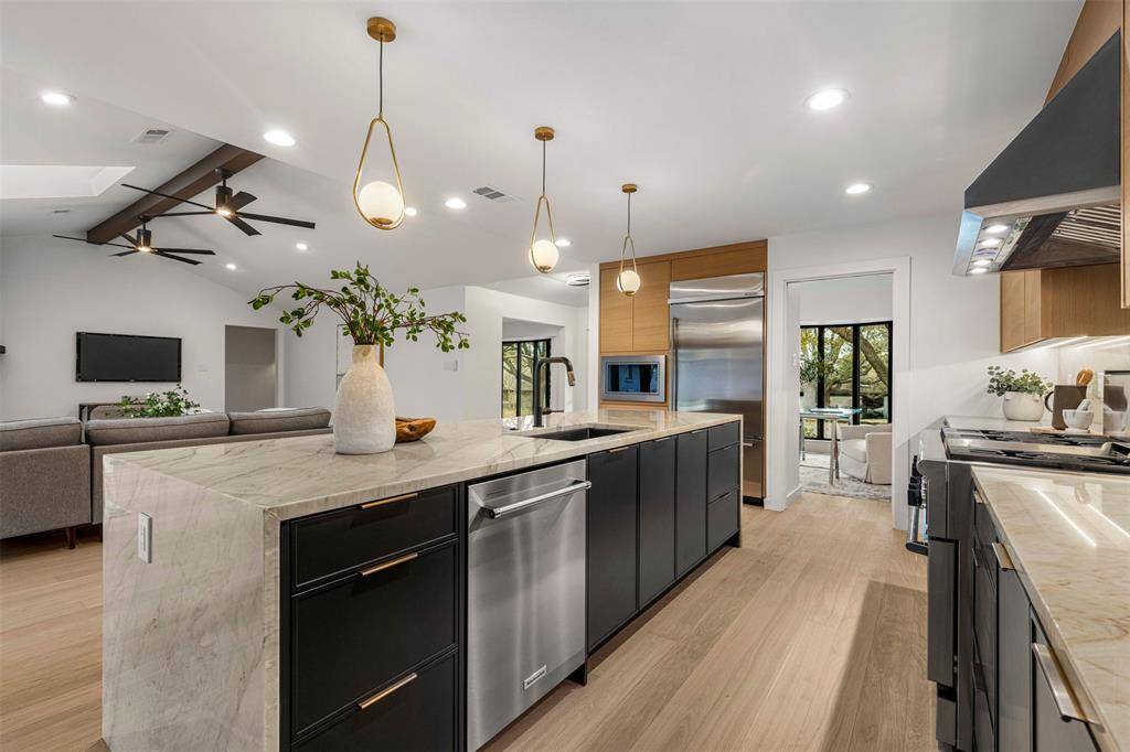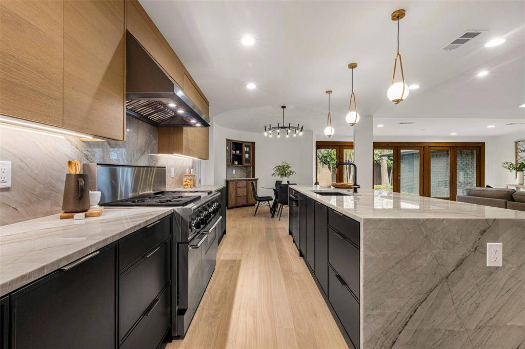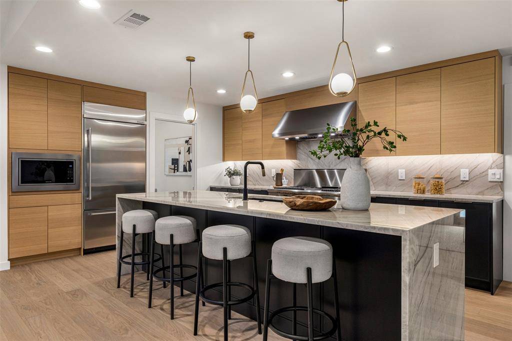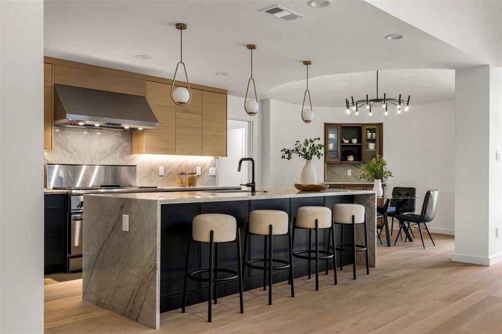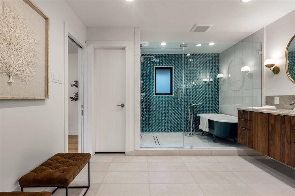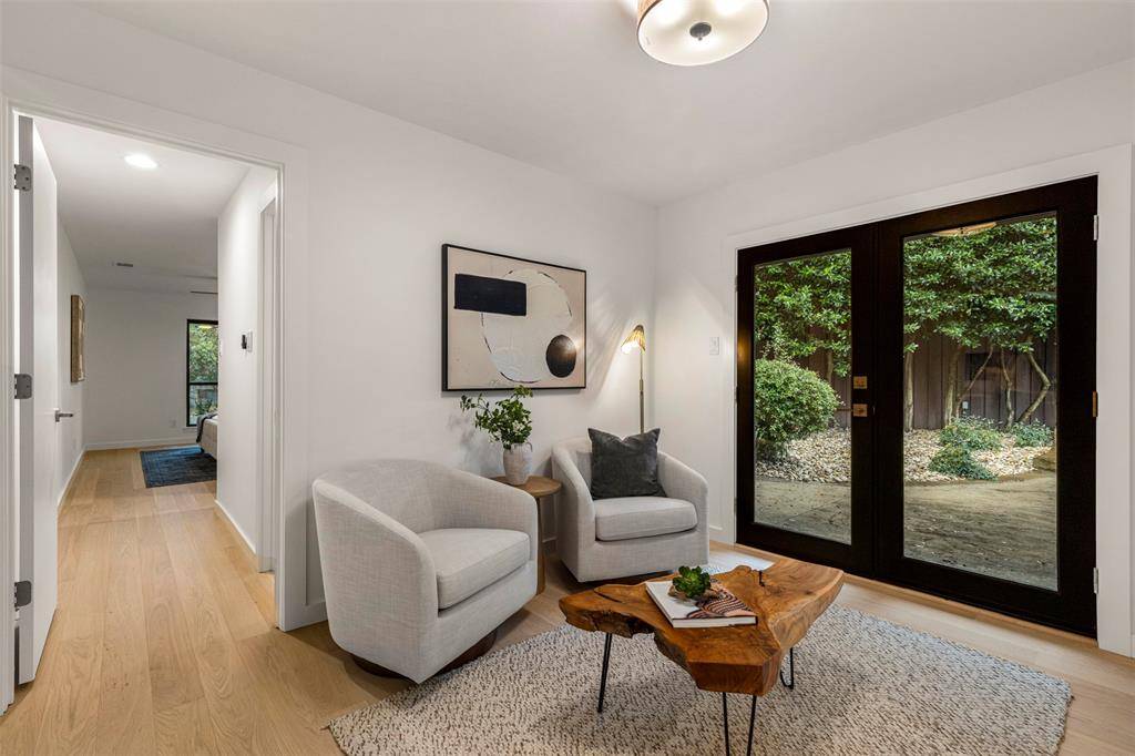 The chef's kitchen is anchored by a waterfall-edge island and equipped with a Thermador 48-inch range with griddle, Elica hood, dual ovens, and Bellmont European cabinetry. A sunlit dining nook and stately dining room invite casual mornings and elevated gatherings. Primary Suite 1 offers a quiet reading nook and private patio—ideal for morning coffee. The spa-inspired bath features bold geometric tilework and a sculptural soaking tub. A secluded Primary Suite 2 provides privacy for guests or multigenerational living, with an adjacent flex space ideal for an office or additional living.