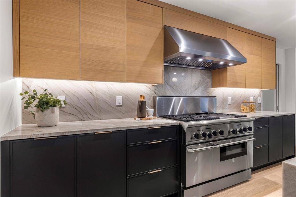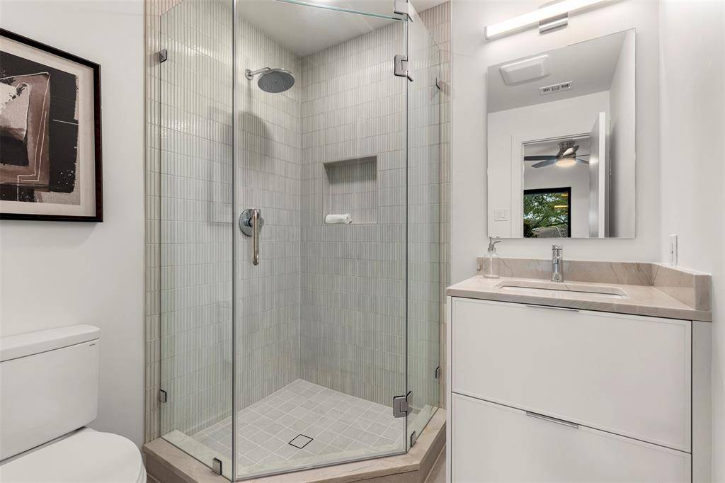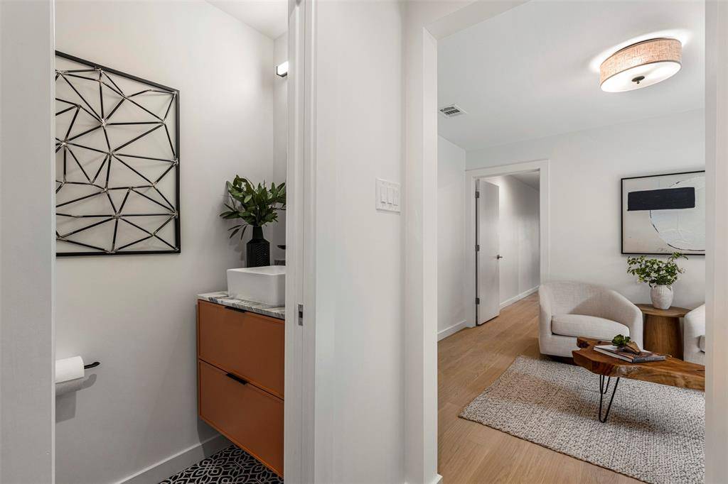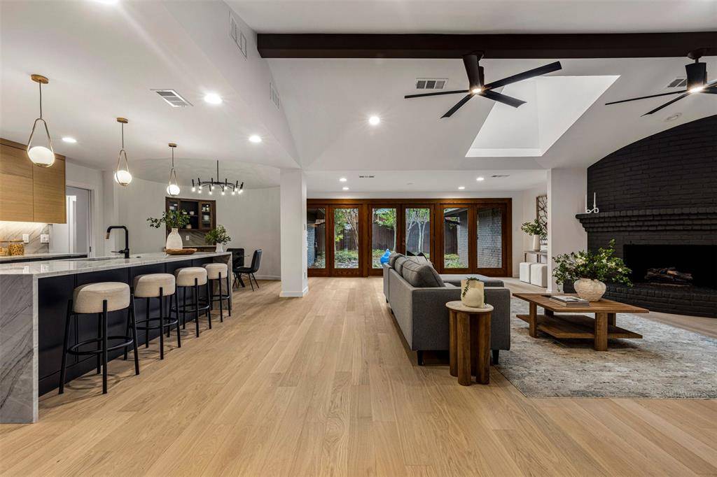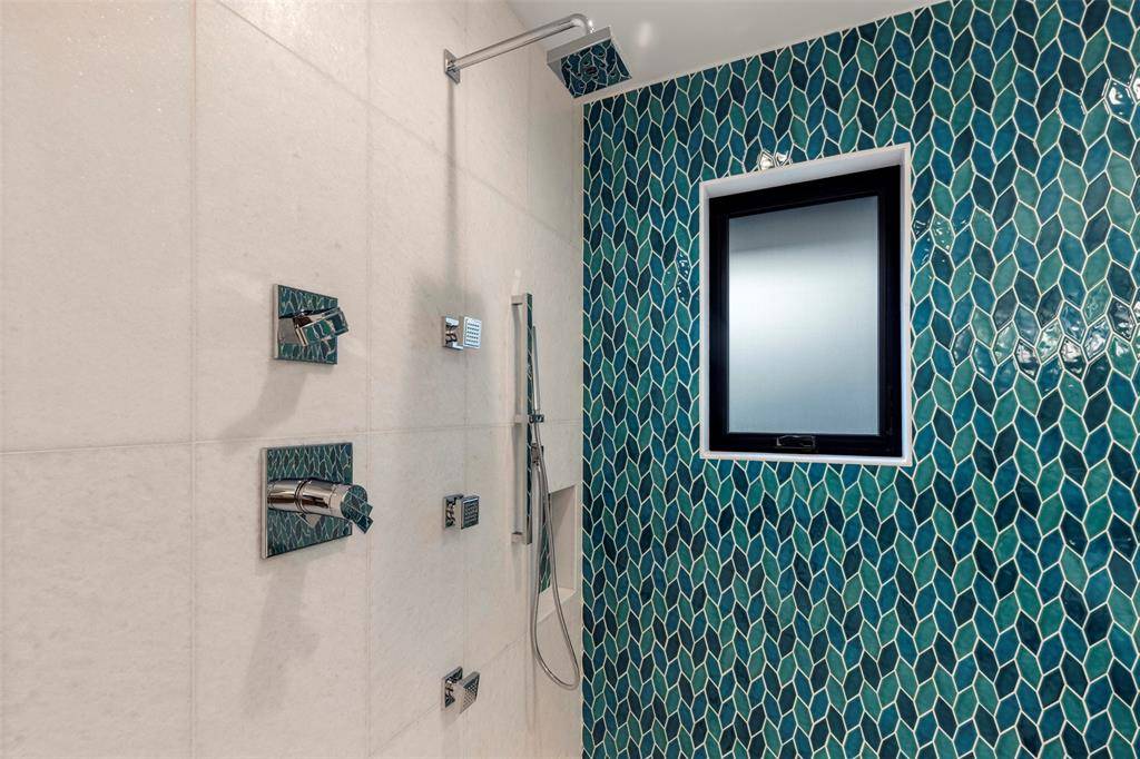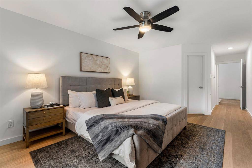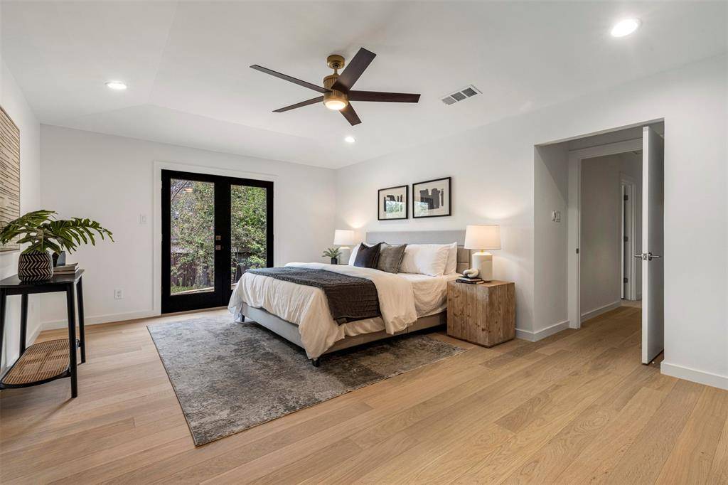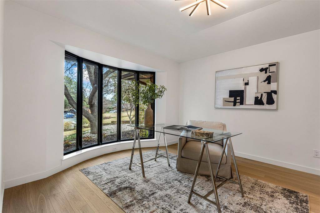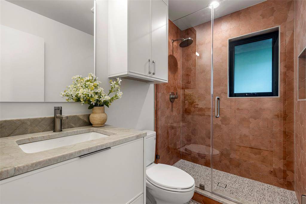 The chef's kitchen is anchored by a waterfall-edge island and equipped with a Thermador 48-inch range with griddle, Elica hood, dual ovens, and Bellmont European cabinetry. A sunlit dining nook and stately dining room invite casual mornings and elevated gatherings. Primary Suite 1 offers a quiet reading nook and private patio—ideal for morning coffee. The spa-inspired bath features bold geometric tilework and a sculptural soaking tub. A secluded Primary Suite 2 provides privacy for guests or multigenerational living, with an adjacent flex space ideal for an office or additional living.