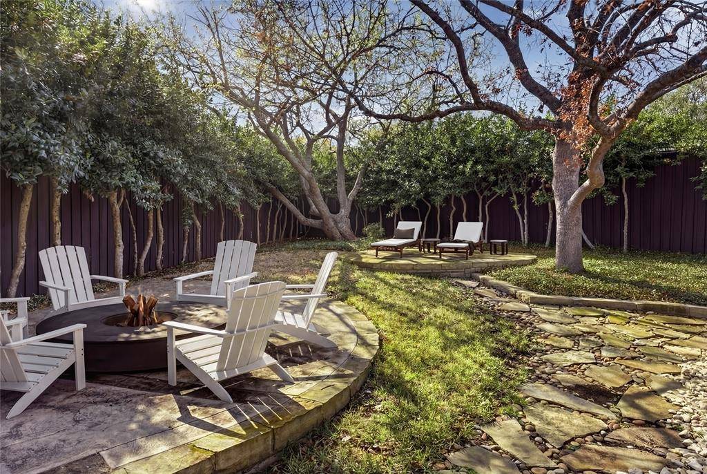 Outdoor living unfolds across layered terraces beneath crepe myrtles, complete with a built-in grill and spa with option to convert to a heated hot tub.