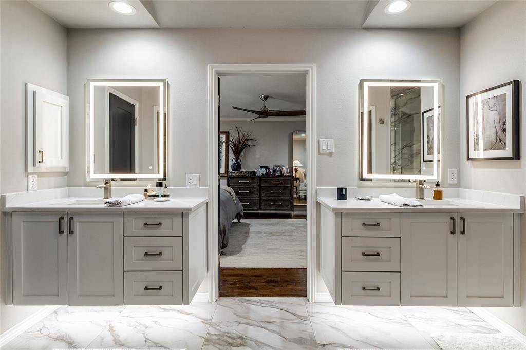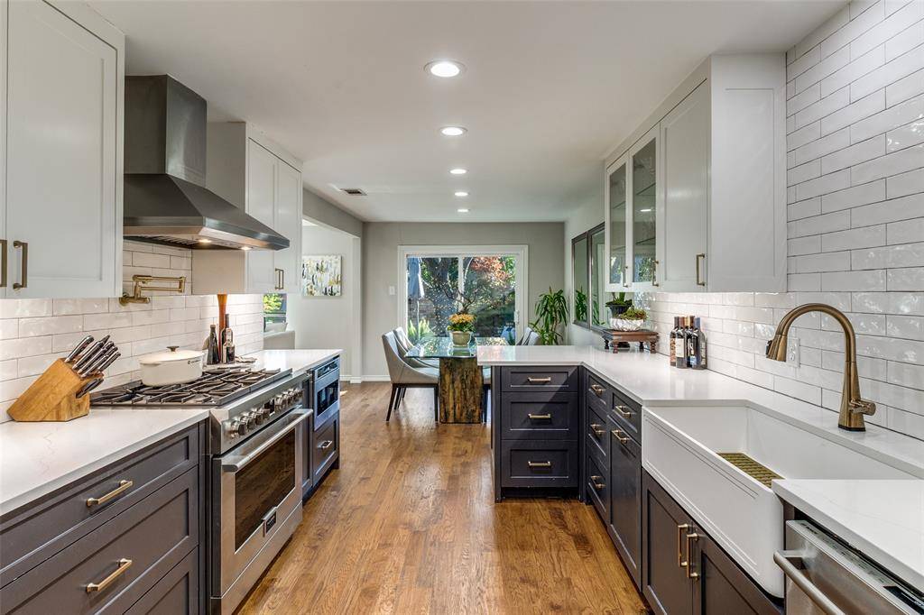 Rarely available, this beautifully renovated single-story home in highly sought-after 12500 Preston offers the perfect blend of modern updates and timeless comfort. Thoughtfully updated in 2022, the home features a fully reimagined kitchen and primary bath, design with both style and functionality in mind. The stunning kitchen showcases granite countertops, custom cabinetry extending to the ceiling, under-cabinet lighting, and soft-close drawers accented with elegant gold hardware. A premium appliance package includes a Bosch refrigerator, dishwasher, and microwave, along with a striking 36-inch Fulton gas range and oven-ideal for both everyday living and entertaining. The primary suite serves as a private retreat, highlighted by a completely remodeled spa-like bathroom featuring a freestanding soaking tub, dual vanities, and a beautifully tiled shower and flooring. Designed for gathering, the living room features a cozy fireplace and a stylish dry bar with custom floating, illuminated shelves. The home offers 3 bedrooms, 2.5 baths, and two spacious living areas, providing flexibility for both relaxation and entertaining. Hardwood floors flow throughout most of the home, including the family room, dining room, kitchen, hallways, and primary bedroom, adding warmth and continuity. Step outside to a hard-to-find backyard oasis complete with artificial turf, a stamped concrete sitting area, a mature trees-creating a low-maintenance yet inviting outdoor space. Additional upgrades include replaced interior wood doors, in-ceiling sound speakers, LED can lighting, and fully landscaped grounds. Residents enjoy access to excellent neighborhood amenities, including a community pool with cabana and tennis courts, enhancing the lifestyle this exceptional home provides.