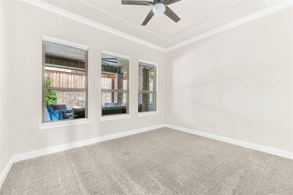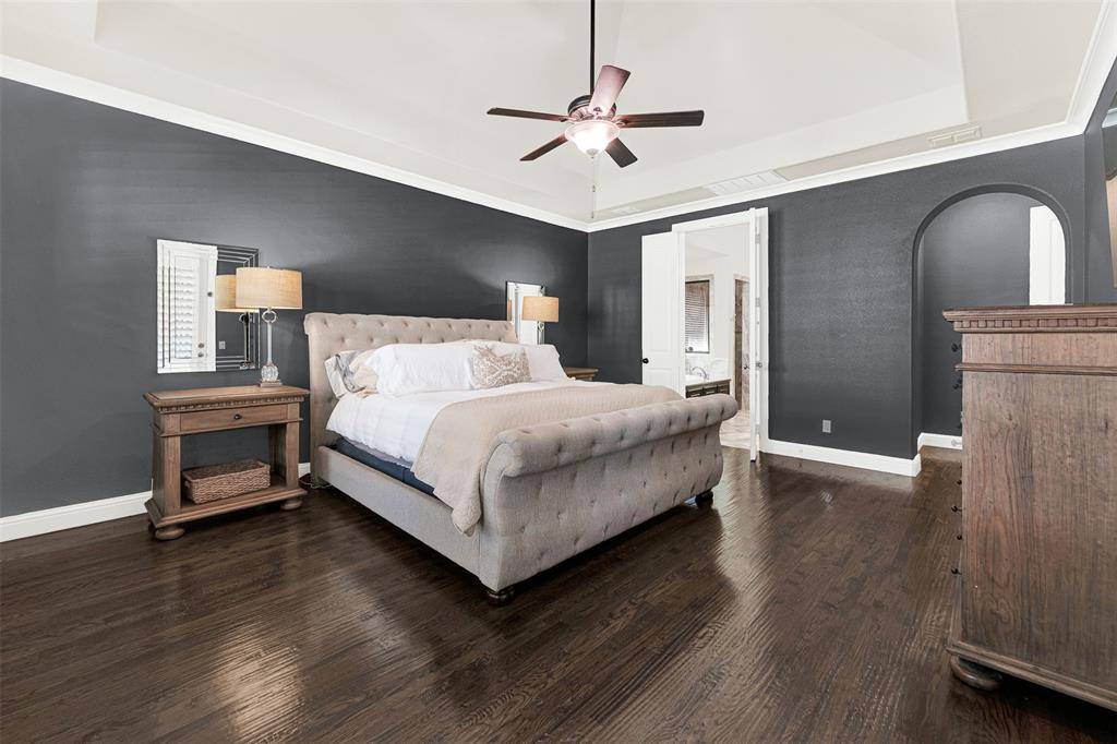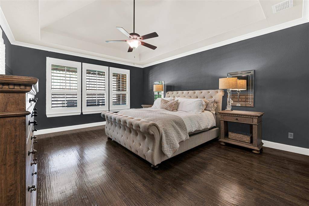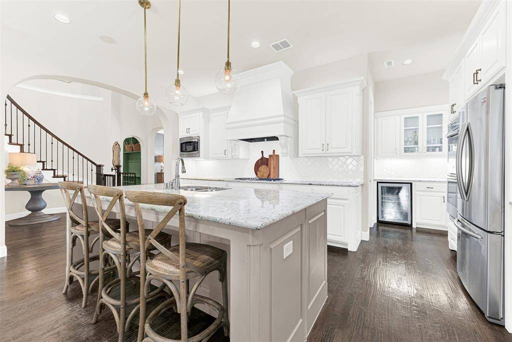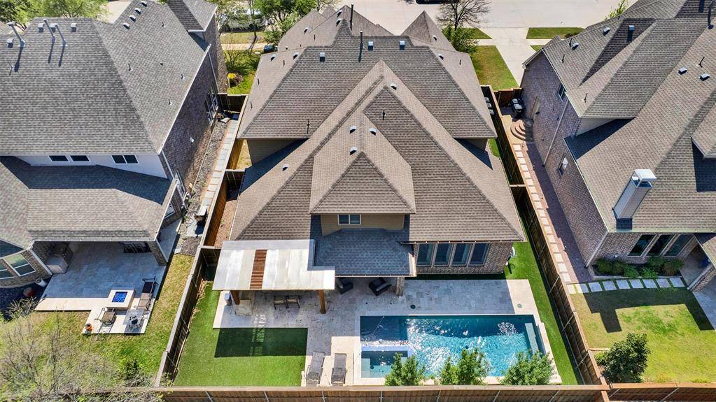 The chef's kitchen blends style and practicality with custom cabinetry, updated hardware, and a designer backsplash. High ceilings and expansive windows flood the living spaces with natural light while offering views of the sparkling backyard pool. Step outside to a private backyard retreat designed for entertaining and relaxation. The outdoor space features a sparkling pool, lush turf, a newly added pergola for shaded lounging, and a dedicated dog run—perfect for hosting friends or enjoying quiet evenings at home. The primary suite offers a luxurious escape with extended hardwood flooring and a custom closet that conveniently connects to the laundry room, complete with storage, a sink, and charming barn doors. A well-designed mudroom provides additional storage and organization, while the spacious downstairs guest suite includes a large closet for added comfort. Upstairs, a beautiful wood landing leads to an expansive game room with media setup, projector, and screen, along with three additional bedrooms and two full baths. With three car spaces- two car garage featuring overhead storage racks plus an additional one-car garage, designer lighting throughout, and exceptional attention to detail, this home perfectly blends style, comfort, and everyday functionality—all in one of Frisco's most desirable locations.