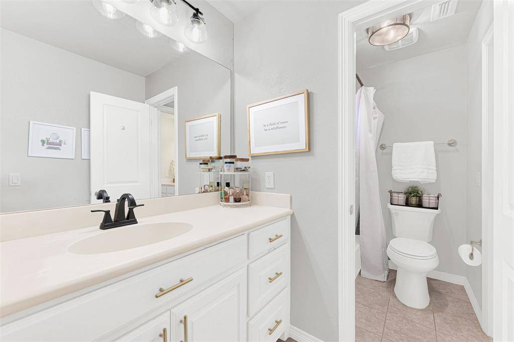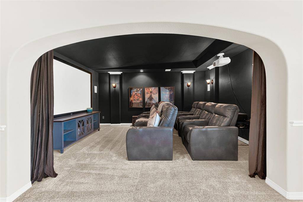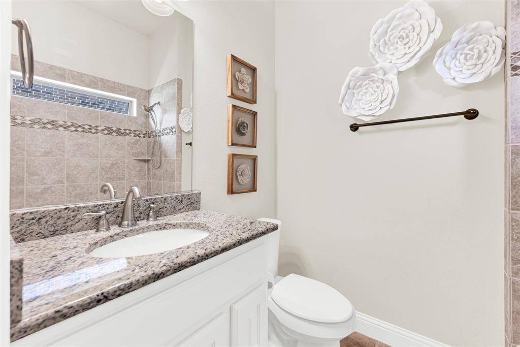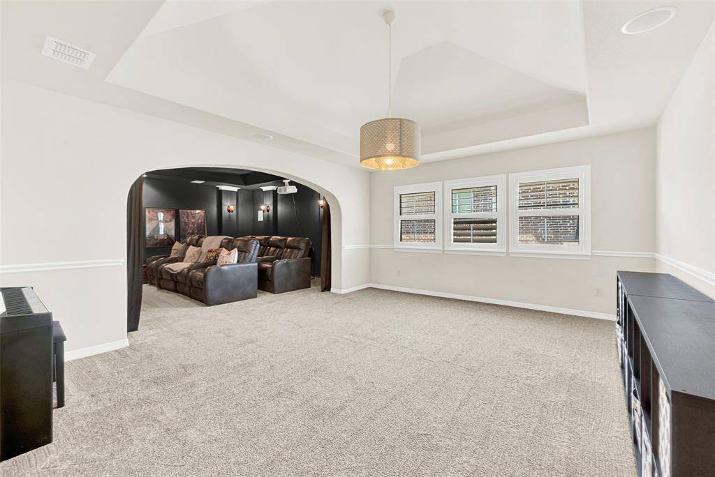 The chef's kitchen blends style and practicality with custom cabinetry, updated hardware, and a designer backsplash. High ceilings and expansive windows flood the living spaces with natural light while offering views of the sparkling backyard pool. Step outside to a private backyard retreat designed for entertaining and relaxation. The outdoor space features a sparkling pool, lush turf, a newly added pergola for shaded lounging, and a dedicated dog run—perfect for hosting friends or enjoying quiet evenings at home. The primary suite offers a luxurious escape with extended hardwood flooring and a custom closet that conveniently connects to the laundry room, complete with storage, a sink, and charming barn doors. A well-designed mudroom provides additional storage and organization, while the spacious downstairs guest suite includes a large closet for added comfort. Upstairs, a beautiful wood landing leads to an expansive game room with media setup, projector, and screen, along with three additional bedrooms and two full baths. With three car spaces- two car garage featuring overhead storage racks plus an additional one-car garage, designer lighting throughout, and exceptional attention to detail, this home perfectly blends style, comfort, and everyday functionality—all in one of Frisco's most desirable locations.