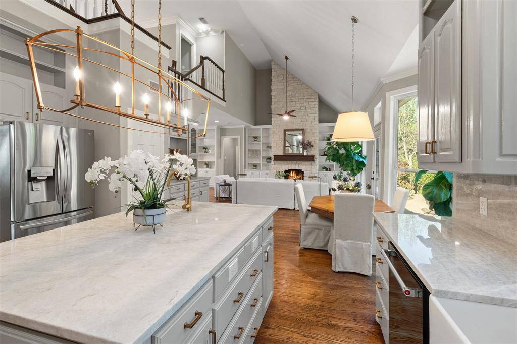 Inside, timeless architecture meets elegant updates. Wood floors, custom lighting, and a soft neutral palette create a warm, refined feel throughout. The open living and kitchen design centers around a stunning, updated kitchen featuring an oversized island, Taj Mahal Quartzite Countertops, built-in beverage refrigerator, and a high-end Wolf gas range — perfect for both everyday living and entertaining.