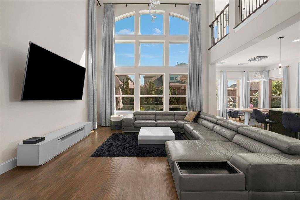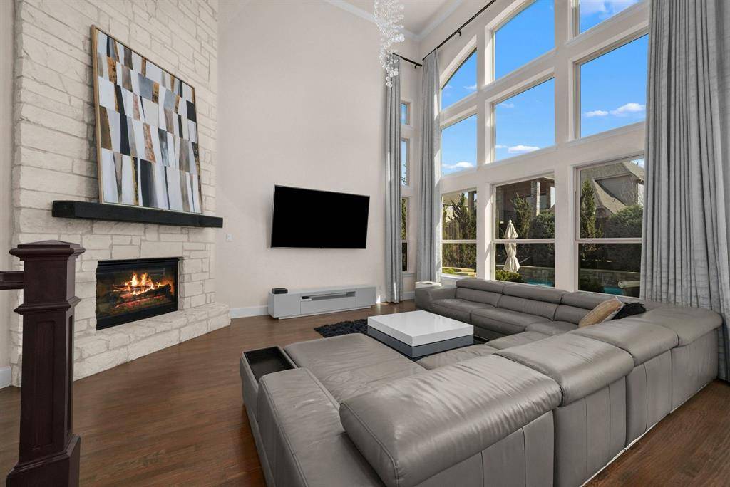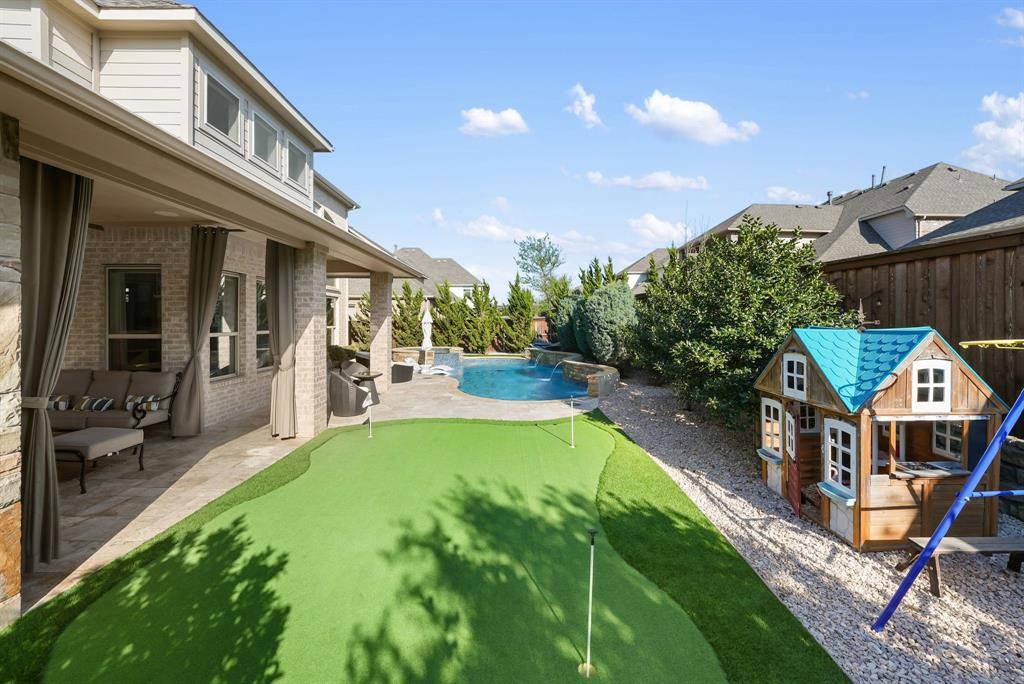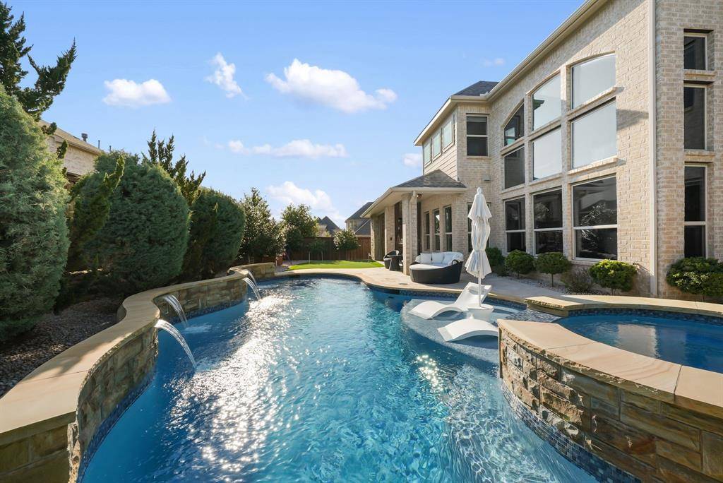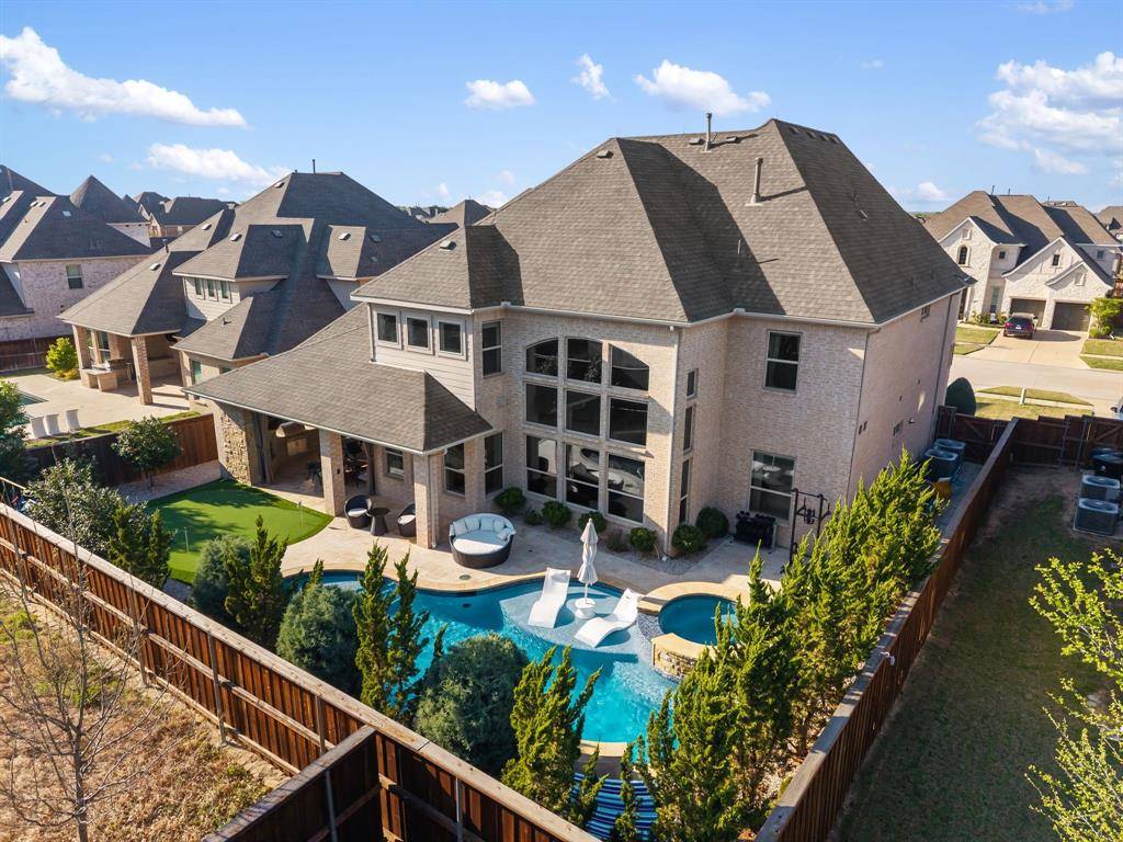 Thoughtfully designed and extensively upgraded, this stunning two-story home at 2353 Flat Creek offers exceptional space, functionality, and high-end finishes throughout. A striking brick and stone elevation with manicured landscaping and a front-entry driveway sets the tone for what awaits inside. The open foyer features rich wood flooring, a sweeping staircase, and seamless flow into the main living areas. The main level showcases a private study with built-ins and double doors, an elegant dining space with accent wall detailing, and a spacious living room highlighted by soaring ceilings, abundant natural light, and a stone-surround fireplace. The chef's kitchen is equipped with quartz countertops, a large island, KitchenAid appliances including double ovens and gas cooktop, farmhouse sink, walk-in pantry, and designer lighting, all opening to a bright breakfast nook with backyard views. A generously sized primary suite offers a relaxing retreat with backyard views, custom finishes, and a spa-inspired bath featuring dual vanities, soaking tub, oversized walk-in shower, and a fully built-out closet. An additional bedroom with en-suite bath, utility room with built-in mud area, and multiple garage spaces—including EV charging—complete the first floor. Upstairs provides incredible flexibility with a large game room, additional open living space, and a fully equipped media room. Secondary bedrooms are well-sized with ample storage, including a Jack-and-Jill layout and an additional full bath. The backyard is an entertainer's dream, featuring a covered patio with fireplace, built-in outdoor kitchen, mounted TV, and fans. The resort-style heated pool and spa with water features, putting green, and thoughtfully designed landscaping create a private outdoor oasis. Phillips Creek Ranch is a peaceful, family-friendly neighborhood in Frisco, TX, known for its well-maintained homes, excellent schools, and community amenities including parks and pools.