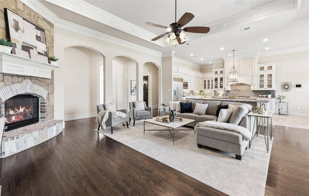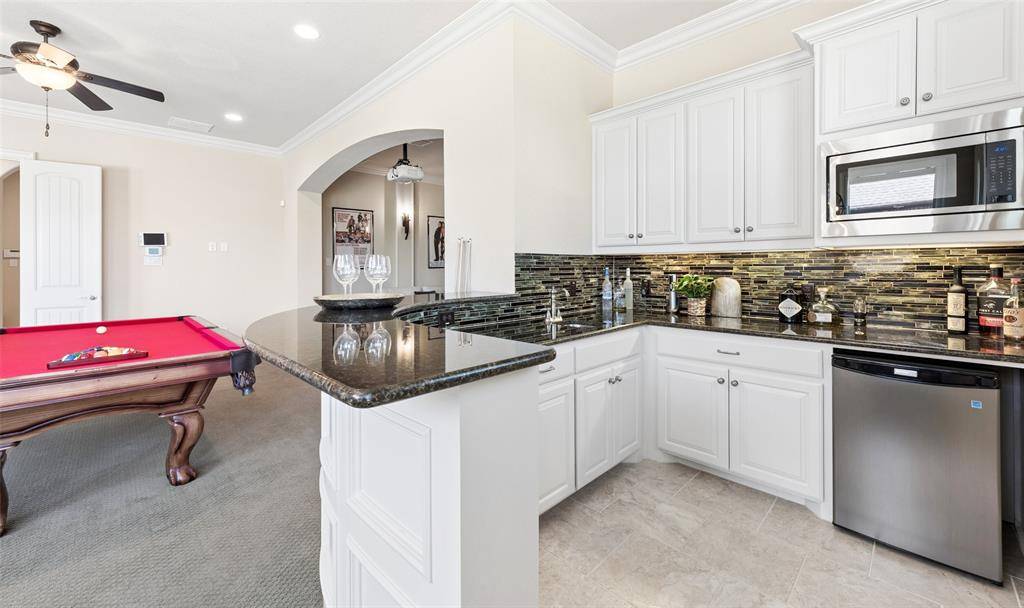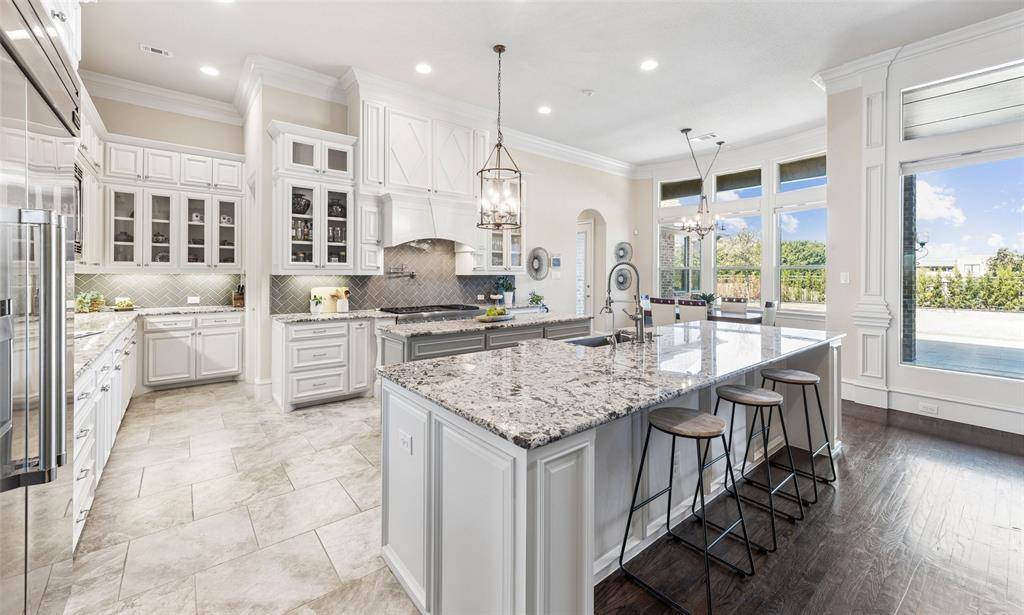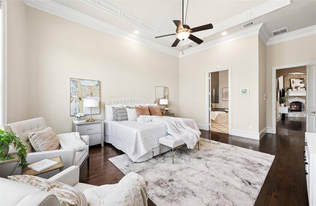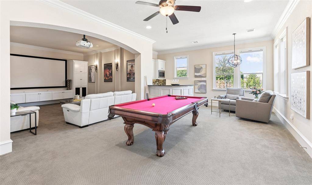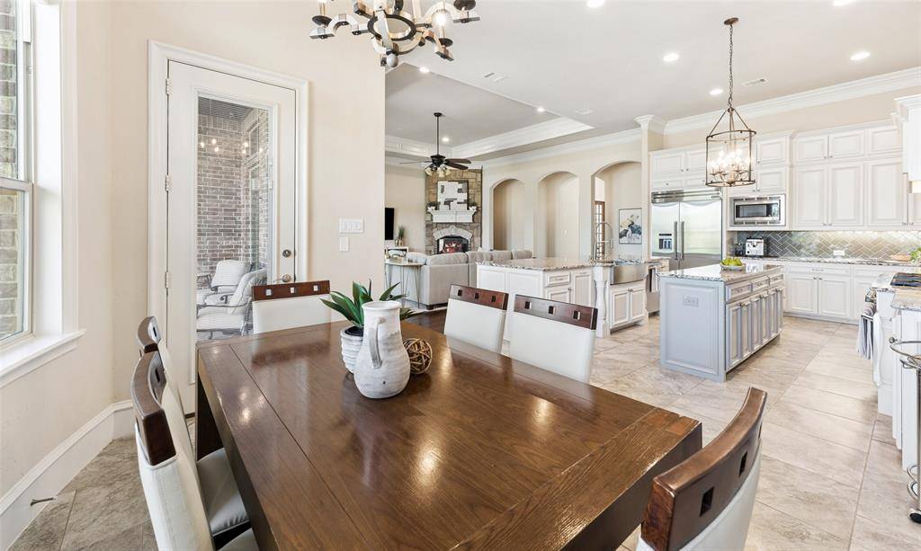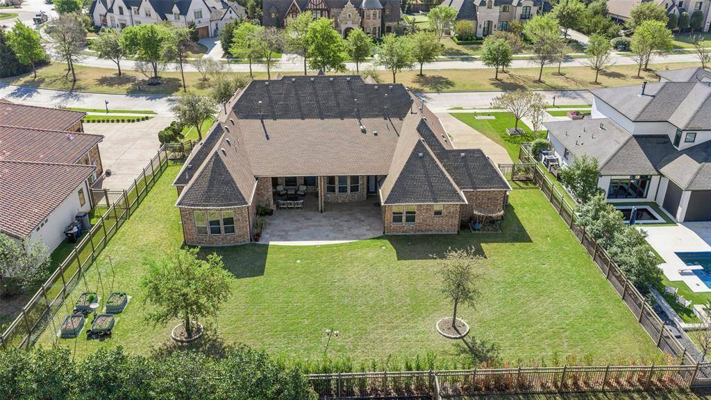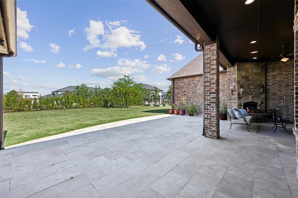 Welcome to an exceptional one-story estate in the prestigious Hills of Kingwood, originally crafted as a formal model home by Our Country Homes, showcasing the builder's finest design, upgrades, & architectural craftsmanship throughout. From the moment you enter, you'll notice the stunning millwork & thoughtful architectural details that set this home apart. The open-concept floorplan is both elegant & functional, centered around a spacious living room with a stone fireplace & expansive views of the backyard. Electric shades on the windows add convenience & comfort, while natural light fills the space. The living area seamlessly flows into a chef's dream kitchen, featuring two oversized islands, a farmhouse sink, & premium Thermador appliances, including a built-in refrigerator, gas range, oven, & microwave, plus a convenient pot filler. The kitchen is complemented by a bright breakfast area, a formal dining room, & a built-in wine bar, perfect for entertaining. The private primary suite offers a true retreat with space for a sitting area. The spa-like bathroom includes a soaking tub, walk-in shower with a rain head, & a linen closet for added storage. Three additional bedrooms are thoughtfully split from the primary suite, providing privacy for family or guests. Designed for both relaxation & entertainment, the home features a game room with a bar that includes a sink, microwave, & fridge that flows into a dedicated media room, ideal for movie nights or hosting gatherings. A richly appointed office with wood paneling, built-ins, & French doors creates the perfect work-from-home environment. Situated on nearly half an acre, the outdoor space is just as impressive. Enjoy the extended travertine patio complete with a fireplace, covered seating area with ceiling fan, and plenty of room to relax or entertain. A charming vegetable garden offers a wonderful opportunity for the next owner to cultivate and personalize. A rare opportunity to own a stunning home in Frisco.