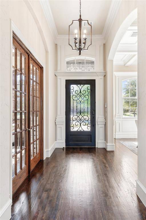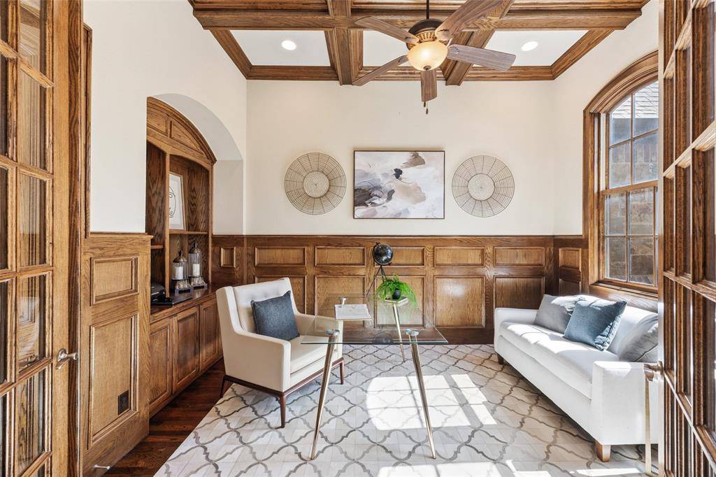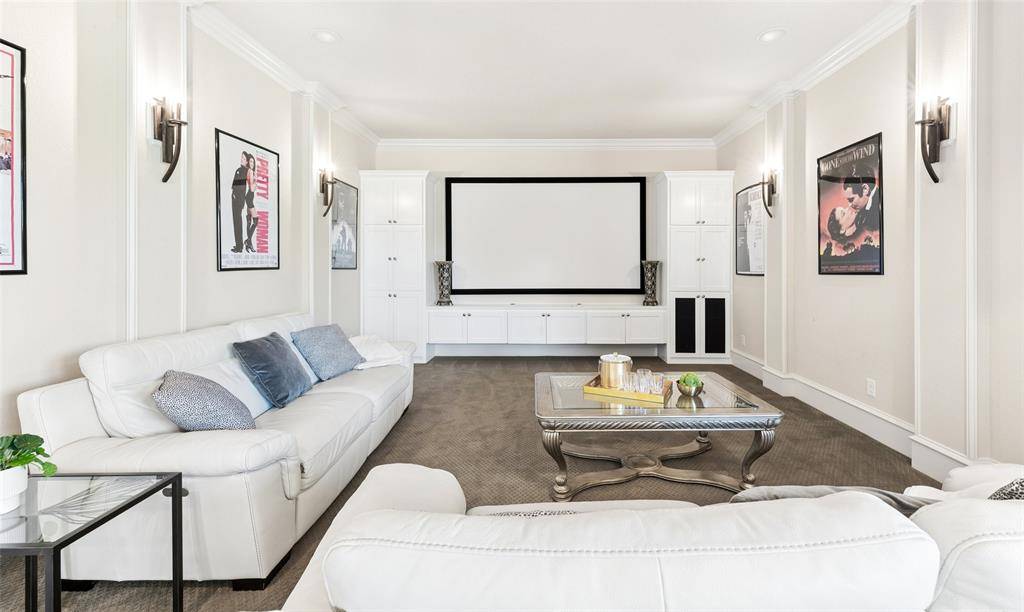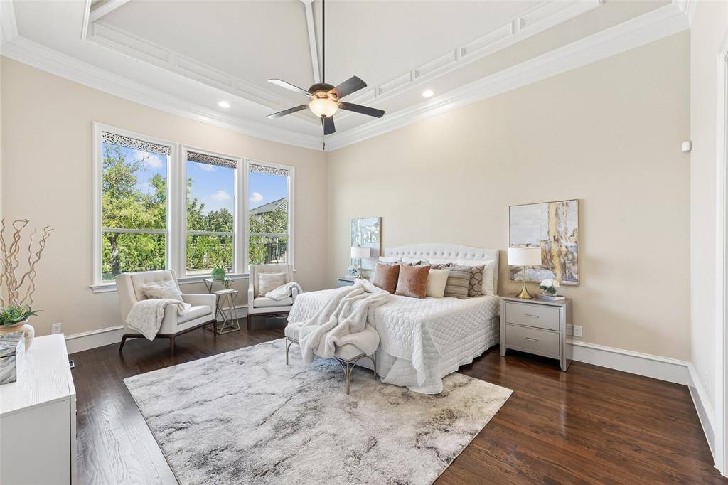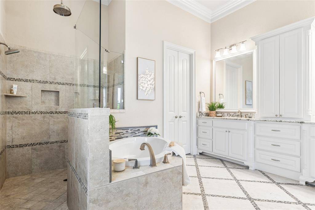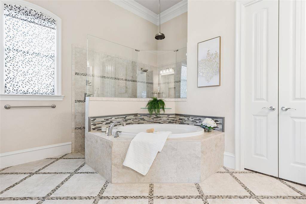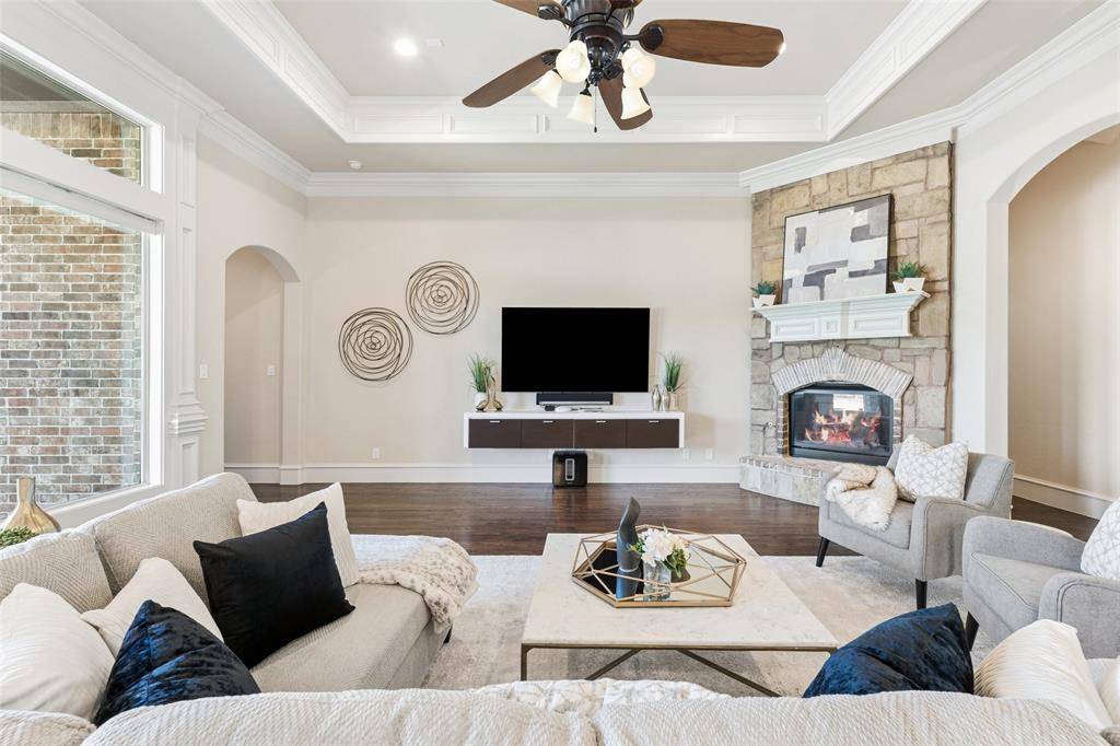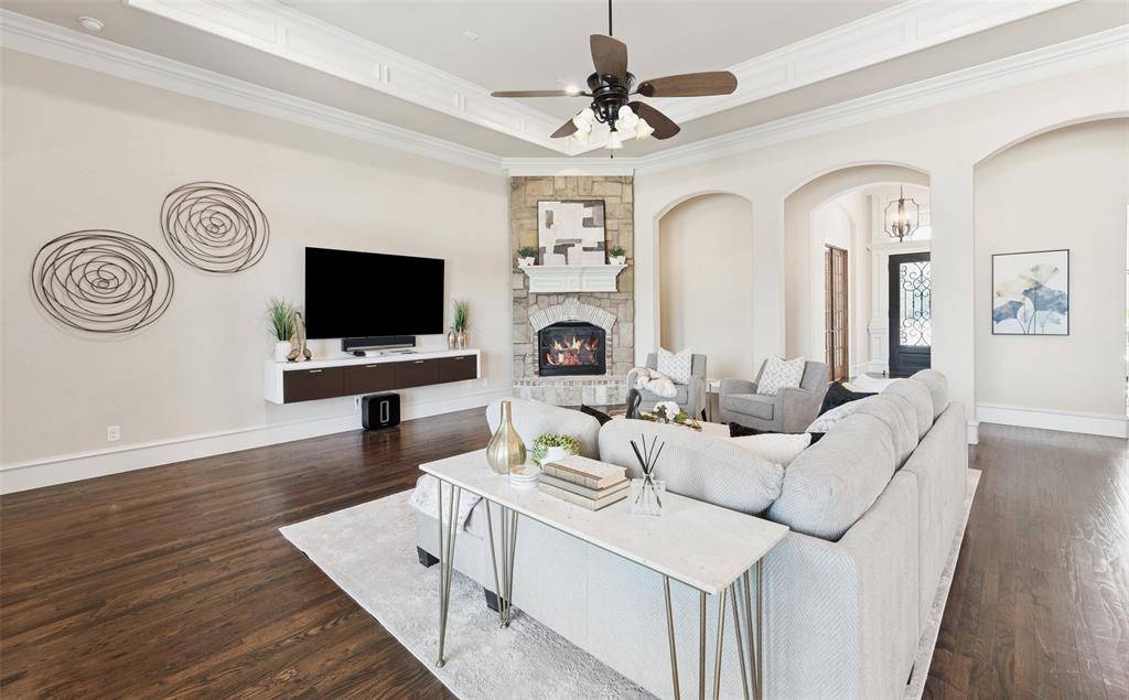 Welcome to an exceptional one-story estate in the prestigious Hills of Kingwood, originally crafted as a formal model home by Our Country Homes, showcasing the builder's finest design, upgrades, & architectural craftsmanship throughout. From the moment you enter, you'll notice the stunning millwork & thoughtful architectural details that set this home apart. The open-concept floorplan is both elegant & functional, centered around a spacious living room with a stone fireplace & expansive views of the backyard. Electric shades on the windows add convenience & comfort, while natural light fills the space. The living area seamlessly flows into a chef's dream kitchen, featuring two oversized islands, a farmhouse sink, & premium Thermador appliances, including a built-in refrigerator, gas range, oven, & microwave, plus a convenient pot filler. The kitchen is complemented by a bright breakfast area, a formal dining room, & a built-in wine bar, perfect for entertaining. The private primary suite offers a true retreat with space for a sitting area. The spa-like bathroom includes a soaking tub, walk-in shower with a rain head, & a linen closet for added storage. Three additional bedrooms are thoughtfully split from the primary suite, providing privacy for family or guests. Designed for both relaxation & entertainment, the home features a game room with a bar that includes a sink, microwave, & fridge that flows into a dedicated media room, ideal for movie nights or hosting gatherings. A richly appointed office with wood paneling, built-ins, & French doors creates the perfect work-from-home environment. Situated on nearly half an acre, the outdoor space is just as impressive. Enjoy the extended travertine patio complete with a fireplace, covered seating area with ceiling fan, and plenty of room to relax or entertain. A charming vegetable garden offers a wonderful opportunity for the next owner to cultivate and personalize. A rare opportunity to own a stunning home in Frisco.
