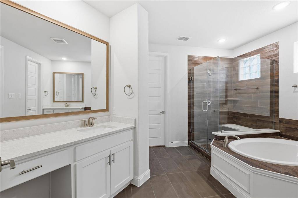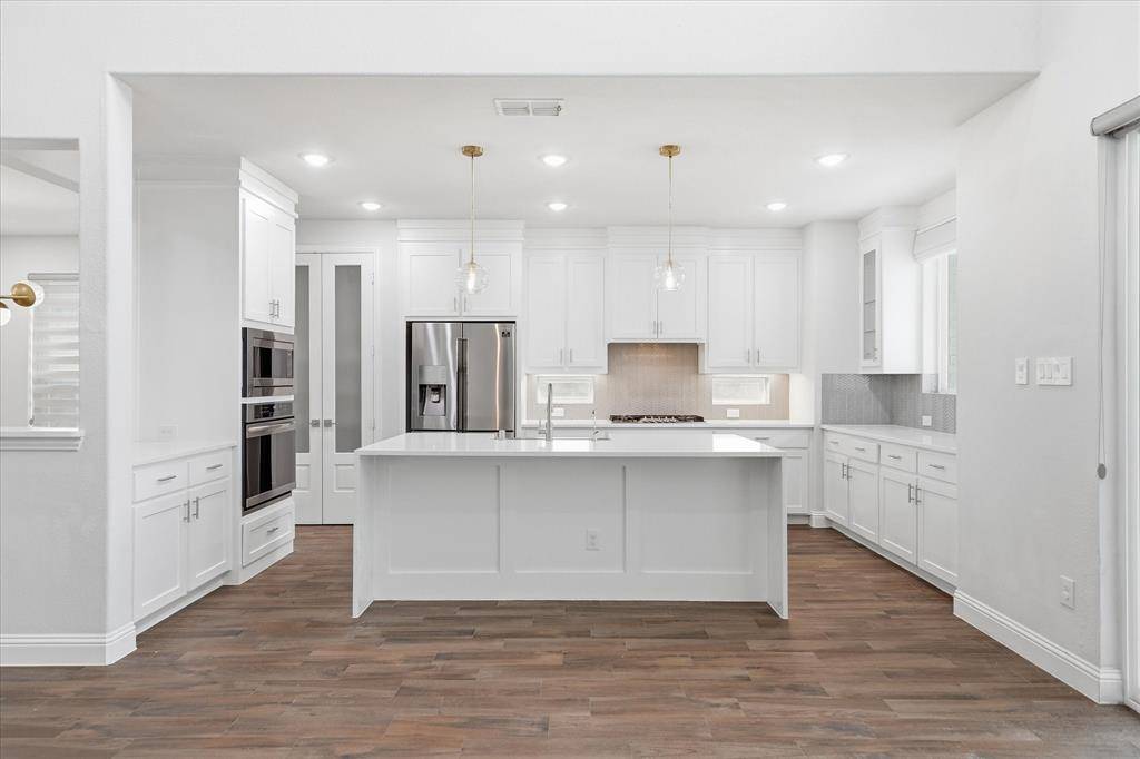 Don't miss this exceptional opportunity to own a highly upgraded 5-bedroom, 4.5-bath home in one of Frisco's most sought-after master-planned communities—The Grove. This home checks every box with a rare floor plan featuring a secondary bedroom on the main level, private home office, and expansive living spaces designed for both comfort and entertaining. The heart of the home is a designer kitchen showcasing quartz countertops, a stunning waterfall island, and an open layout that flows seamlessly into the main living area. Upstairs, enjoy a spacious game room and dedicated media room—perfect for hosting, relaxing, or creating unforgettable family moments. Step outside to your covered patio, ideal for year-round outdoor living. Added upgrades like a tankless water heater provide efficiency and long-term value. Located in The Grove, residents enjoy resort-style amenities including scenic parks, miles of walking trails, and a state-of-the-art fitness center. Front yard maintenance is covered by HOA, offering a truly low-maintenance lifestyle