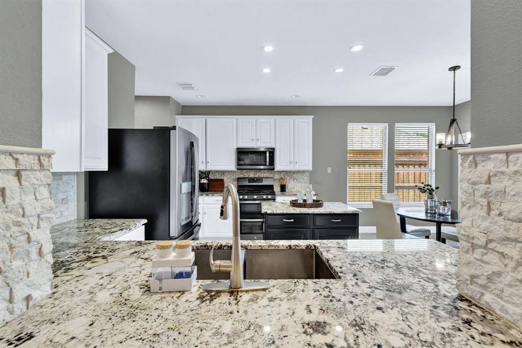 Experience the vibrant Frisco lifestyle in this beautiful open-concept gem! Designed for both hosting holidays and everyday comfort. The bright kitchen features newer appliances, gas cooking, a center island, granite countertops and raw marble back-splash, all overlooking the main living room. Floor to ceiling stone fireplace serves as a sophisticated focal point in the generous sized living room. Primary suite downstairs and 3 additional bedrooms and versatile loft upstairs. The dedicated home office with wrap around desk and French doors provides the ultimate quiet space for remote work. Location is everything! You are just minutes away from exemplary Frisco ISD schools, upscale shopping and dining, Golf courses, The Star and the highly anticipated Universal Kids Resort. Easy access to Sparks Elementary, HEB Grocery, JR Newman Park - splash pad playground, basketball courts ... all close by. Roof replaced in 2022, both HVAC systems replaced in 2023. Solid surface flooring throughout downstairs