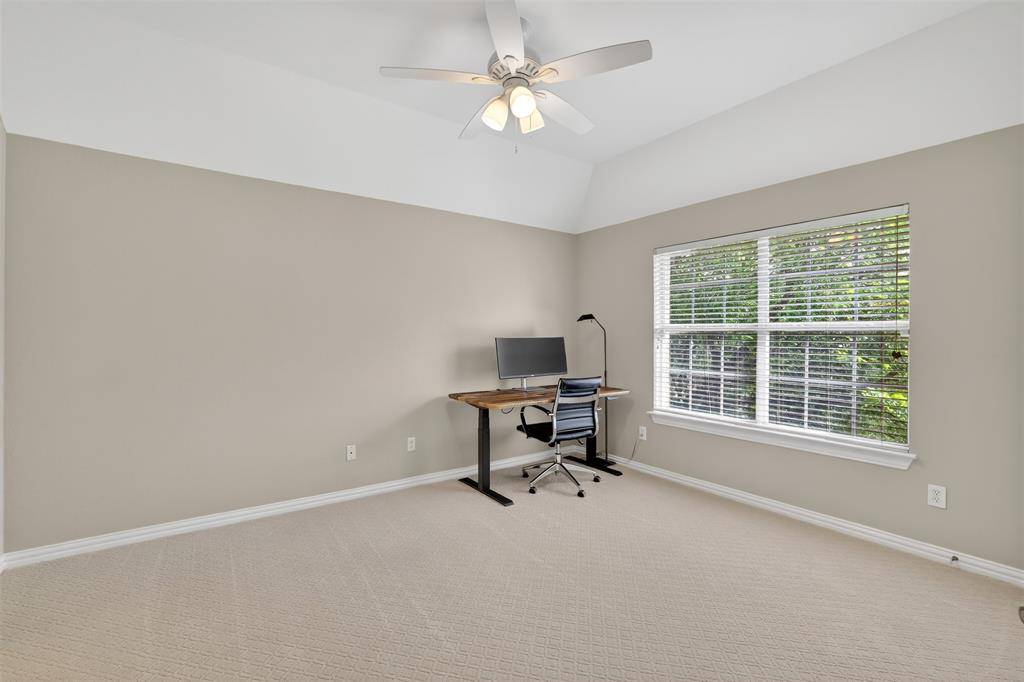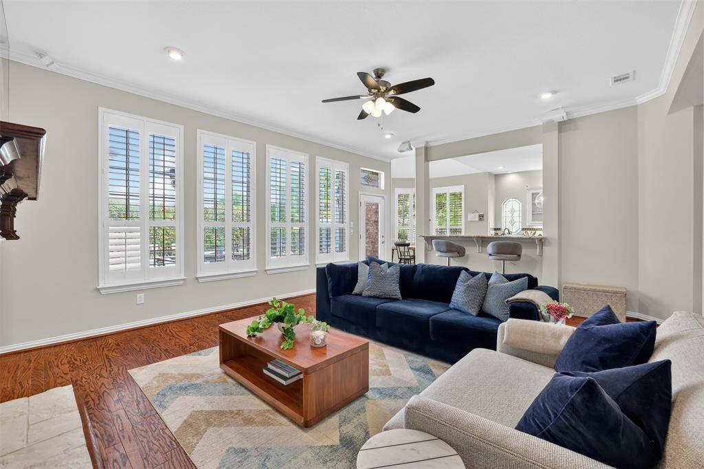 Step inside is the open floor plan filled with natural light and features rich hardwood floors, high ceilings, and large windows with plantation shutters. The functional kitchen is equipped with stainless steel appliances, granite countertops, extensive cabinetry, and a generous breakfast area—ideal for everyday living and entertaining. Seamlessly open to the family room, this space serves as the heart of the home. The light-filled dining room sits just off the kitchen, while the formal living room near the entry offers versatility as a sitting area or the perfect space for a piano. A separate flex room with premium exercise flooring over hardwood offers additional versatility as a private office or fitness space.